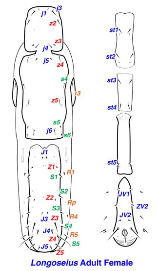 is divided between st2–3 and consists of subequal plates each of which bear 2 pairs of setae (e.g., Longoseius (Longoseius), Microsejus).