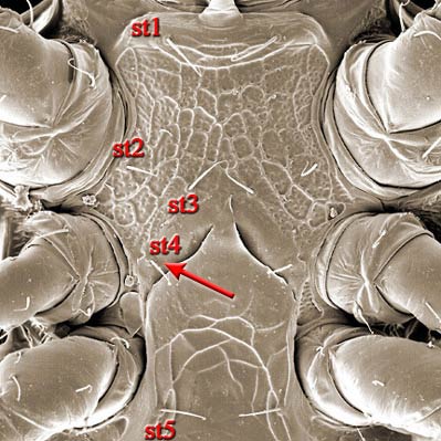 in Mesostigmata, the five pairs of setae in the intercoxal region designated st1-5; st1-3 are present in the larva and usually are borne on a sternal shield in the adult female; st4, the metasternal setae, are added in the deutonymph, often are borne on metasternal platelets, and sometimes on the sternal shield; st5, the genital setae, are added in the protonymph and usually borne on or are inserted laterad the epigynal shield in the adult female.