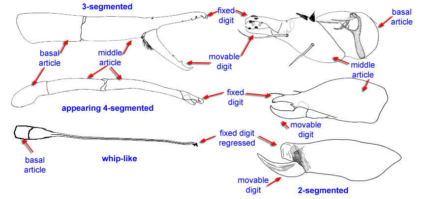 The first pair of limbs in arachnids are called chelicerae. Primitively these are pincer-like and composed of 3-segments: basal articlebasal article:
