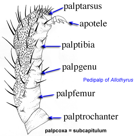 (= pedipalp) the second pair of limbs in arachnids, used in feeding and originating on either side of the chelicerae. In mites, the palps may be vestigial, with only a few segments, or have a maximum of 5 freely articulating segments (rarely the femur is subdivided) and a distal or subdistal apotele. coxae are fused to form the subcapitulumsubcapitulum: