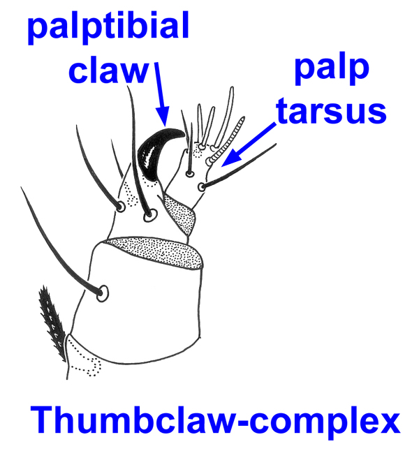 ) and an often swollen palptarsus (the thumb). The arrangement is called a thumb-clawthumb-claw:
