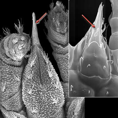 Ticks (Ixodida) have a distinctive holdfast structure composed of a projecting hypostome covered with posteriorly projecting denticlesdenticles: