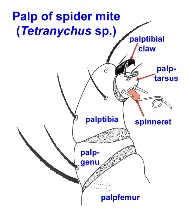 a structure that produces silken fibers. In spider mites, the spinneret is in the form of a short, blunt seta-like structure on the palp tarsus.