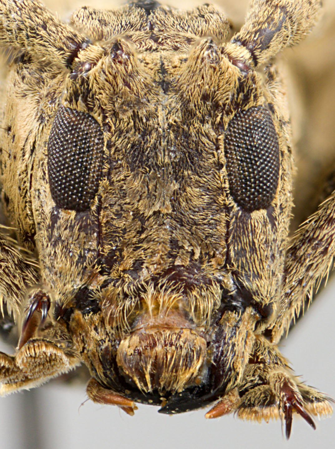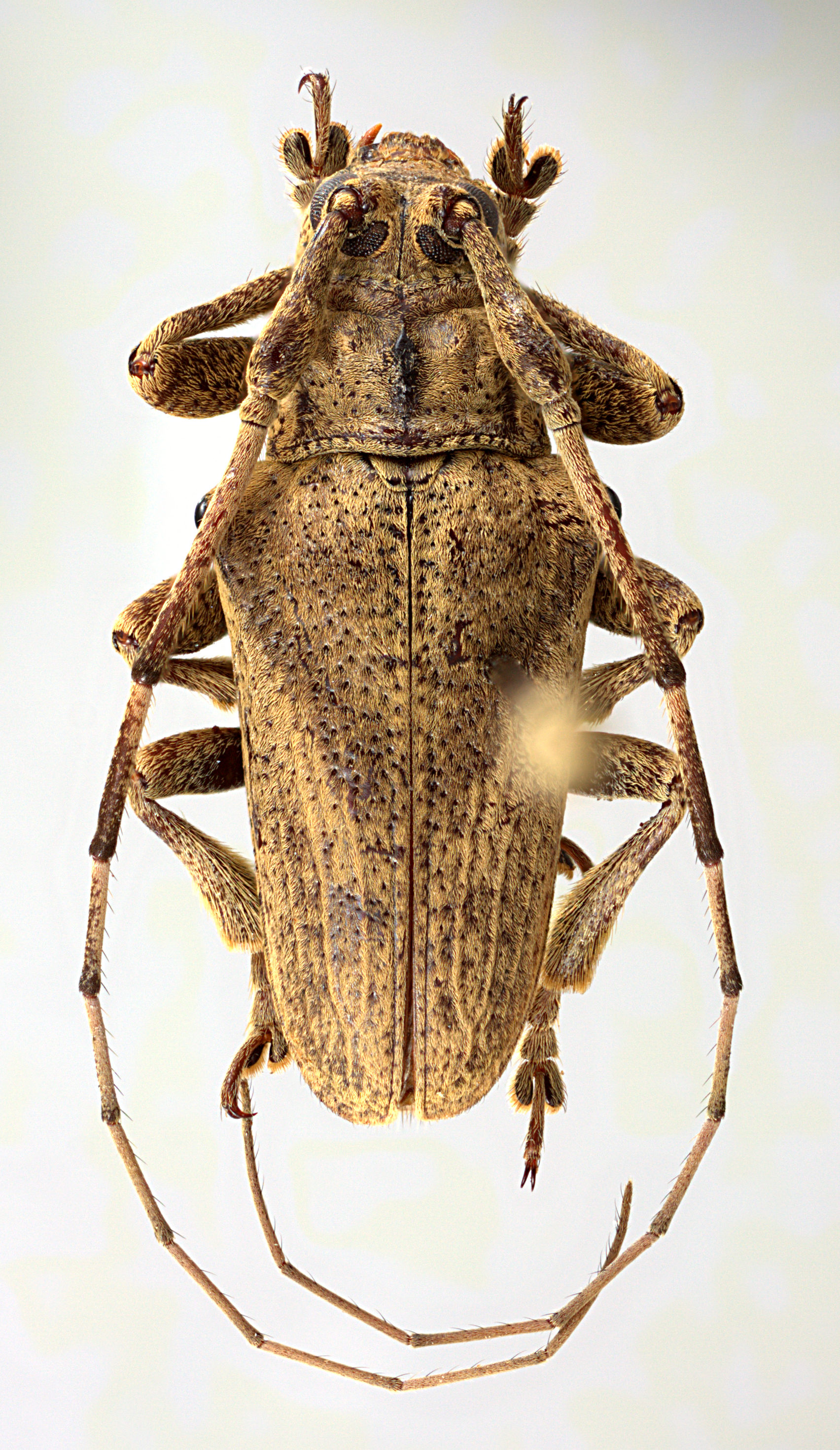 Elongate-ovate, robust, small to moderate-sized, ranging from about 10–14 mm in length. Integument generally dark brown with ferrugineous and ochraceous pubescence. Head with frons elongate, about as wide as width of two lower eye lobes. Eyes with lower lobes ovate-oblong. Genae elongate, about as tall as lower eye lobes. Antennal tubercles prominent, narrowly to moderately separated; tubercles not armed at apex (females) or armed with small projection (males). Antennae about as long (females) to distinctly longer (males) than overall body length; scape clavate, shorter than antennomere IV; antennomere III sinuate, longer than scape and IV; antennomere XI shorter than X (females) or slightly longer than X (males). Pronotum transverse, conical, wider at base, without lateral tubercles. Elytra attenuate to apex; elytral apices individually rounded; elytra generally uniform in coloration, often with vague, pale vittae; base of elytra with two prominent tubercles at humeri; each tubercle followed by a short carina. Basal 1/3 of elytra moderately to densely punctate, surface coarsely punctate to granulate-punctate. Procoxae without projection (females) or with distinct, curved hook. Mesosternal process with apex deeply emarginate. Metafemora moderate in length, about 1/2–1/3 as long as elytra.