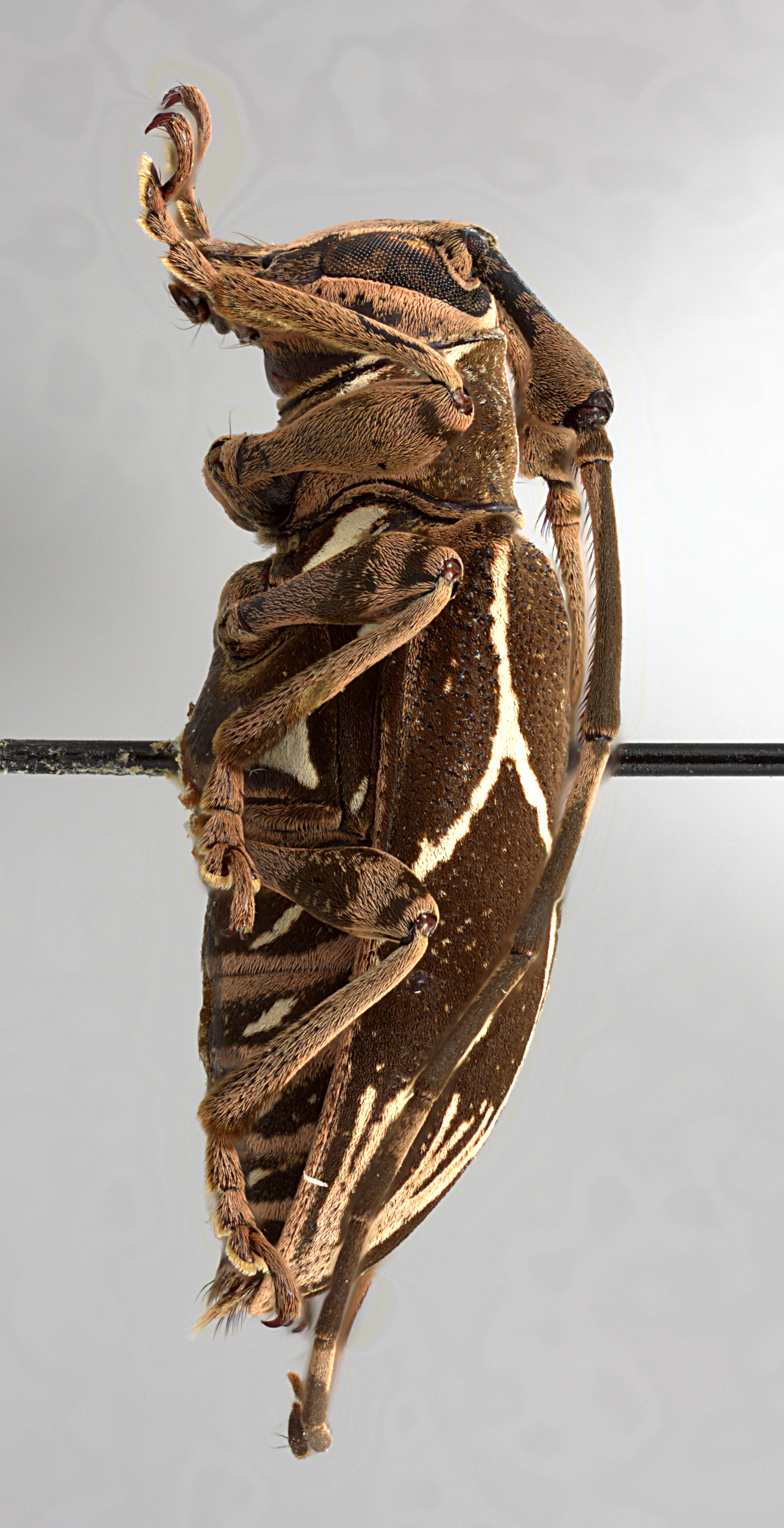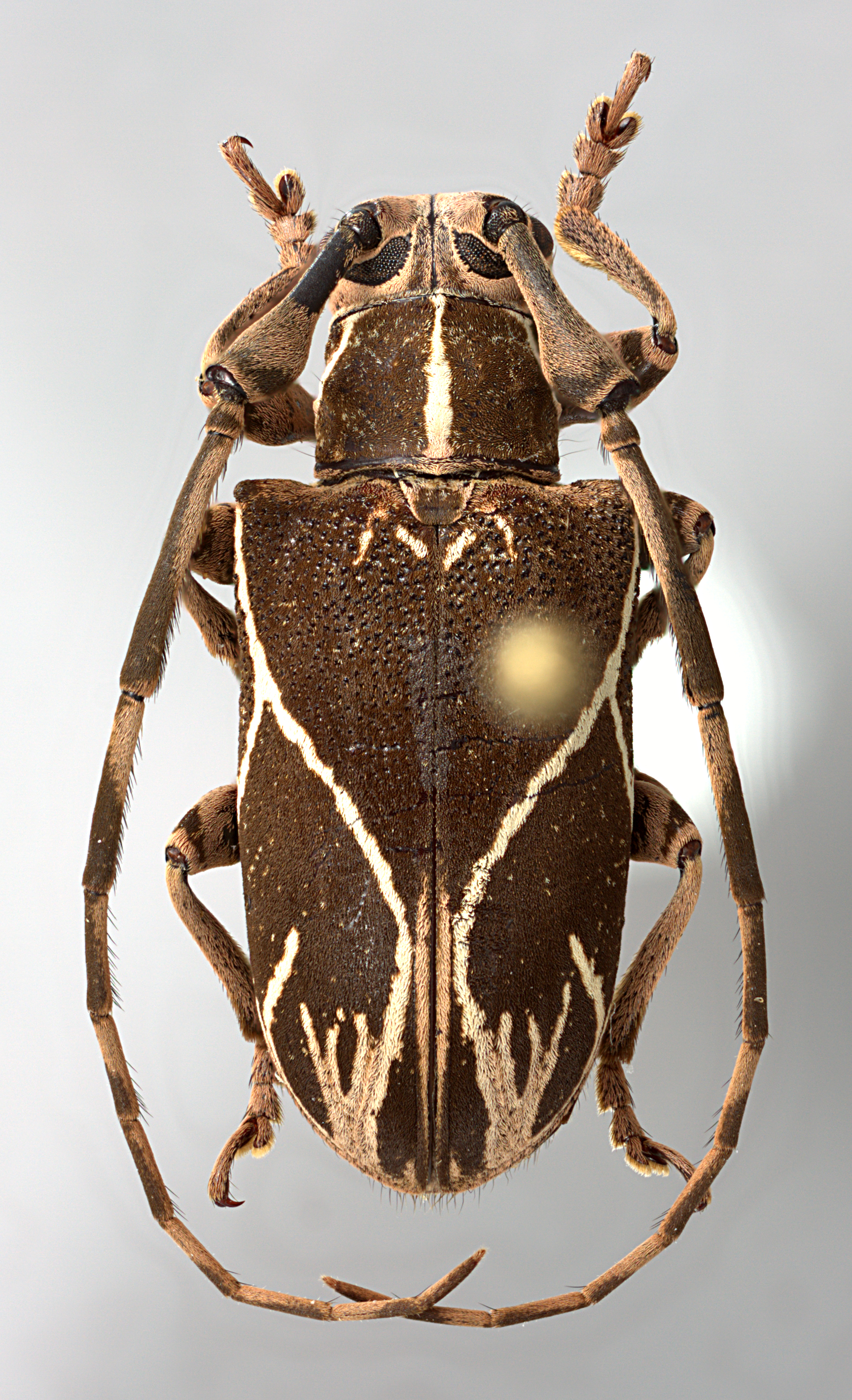 Elongate-ovate, moderate-sized, ranging from about 14–15 mm in length. Integument generally dark brown with whitish, brownish, and ochraceous pubescence. Head with frons subquadrate, about as wide as width of two lower eye lobe; frons distinctly convex. Eyes with lower lobes oblong. Genae subquadrate to elongate, distinctly shorter than lower eye lobes. Antennal tubercles prominent, widely separated; tubercles not armed at apex or with small projection or short, blunt horn (males). Antennae distinctly longer than overall body length, as much as two times longer (males); scape clavate, with distinct cicatrix at apex; about as long or longer than antennomere IV; antennomere III slightly curved, longer than scape and antennomere IV. Pronotum transverse, roughly cylindrical to conical, wider at base; pronotum without lateral tubercles. Elytra with sides roughly parallel; elytral apices individually rounded; elytra with distinct, pale transverse lines; base of elytra without prominent tubercles or with two prominent tubercles at humeri. Basal 1/3 of elytra with dense punctation, surface finely punctate to granulate-punctate. Procoxae without projection or with distinct, curved hook (males). Mesosternal process with apex feebly to deeply emarginate. Metafemora moderate in length, about 1/3 as long as elytra.
