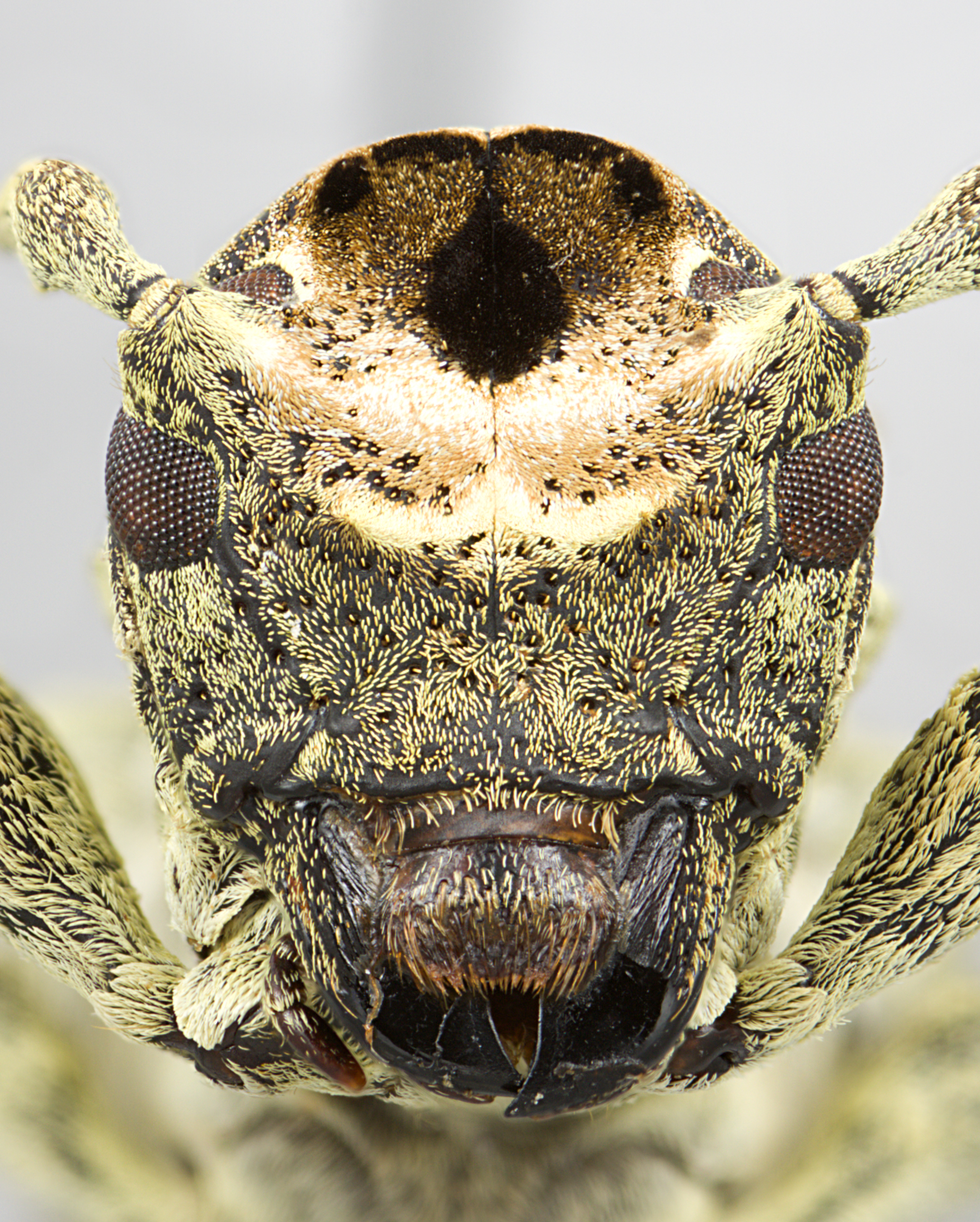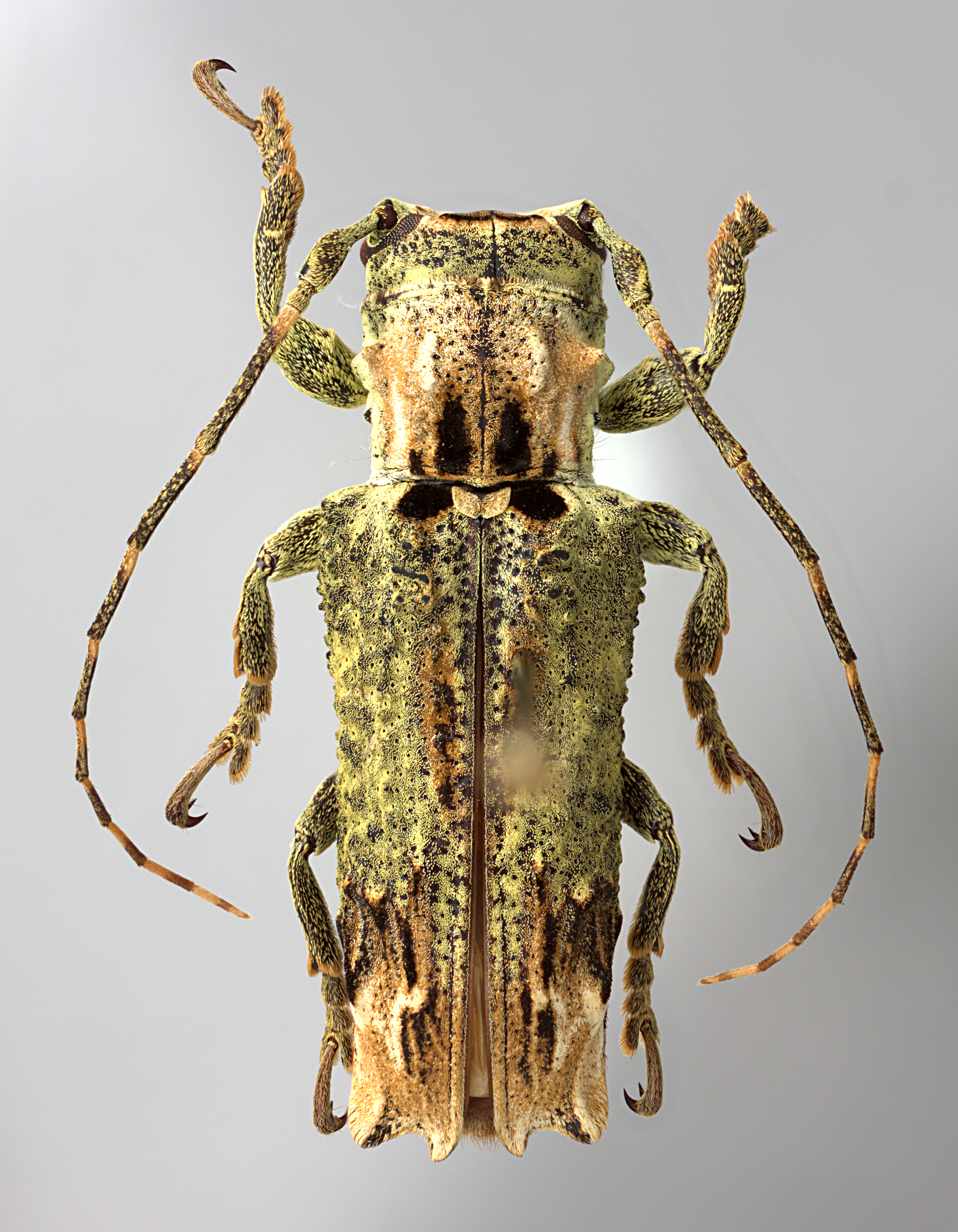 Elongate-oblong, robust, small to large-sized, ranging from about 8–22 mm in length. Integument generally dark brown with whitish, ochraceous, black, and greenish pubescence. Head with frons transverse, narrower below eyes, about as wide as width of four lower eye lobes; frons surface roughly sculptured or not. Entire surface of head often finely punctate, each puncture bearing a fine scale in its center. Eyes with lower lobes small, ovate. Genae elongate, about as tall to distinctly taller than lower eye lobes. Antennal tubercles prominent, widely separated; tubercles not armed at apex (females) or armed with a moderately long, acute horn (males). Antennae about as long as overall body length (females), or as much as 1 1/2 times as long (males); scape clavate, about as long or shorter than antennomere IV; antennomere III nearly straight or curved, longer than scape and antennomere IV. Pronotum transverse, roughly cylindrical, slightly narrower at base, with lateral tubercles. Elytra with sides roughly parallel; elytral apices individually bidentate; elytra generally greenish with distinct areas of contrasting color; base of elytra with several prominent, irregularly shaped, rough, blunt tubercles at humeri. Basal 1/3 of elytra moderate to dense punctation, surface coarsely punctate to granulate-punctate. Procoxae without projection. Mesosternal process with apex subtruncate to feebly emarginate. Metafemora short in length, about 1/4–1/5 as long as elytra.