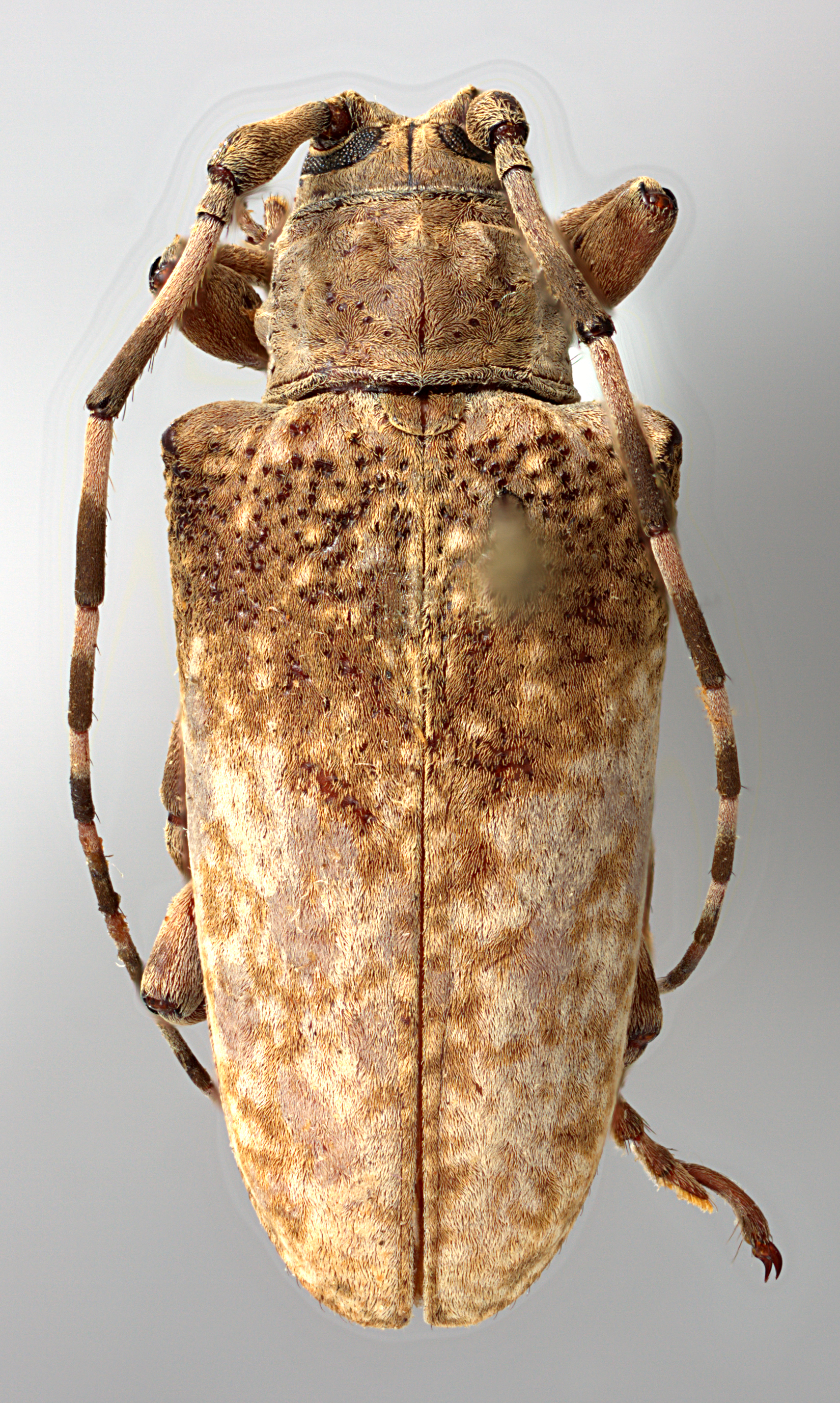 Elongate-oblong, moderate-sized, ranging from about 13–18 mm in length. Integument generally ferrugineous with whitish, ferrugineous, and ochraceous pubescence. Head with frons subquadrate, about as wide as width of 2 1/2 lower eye lobes. Eyes with lower lobes oblong, slightly narrowed. Genae elongate, distinctly shorter than lower eye lobes. Antennal tubercles prominent, moderately separated; tubercles not armed at apex (females) or armed with a small projection, or with a short, blunt horn (males). Antennae about as long as overall body length (females), or as much as 1 1/2 times as long (males); scape clavate, about as long or longer than antennomere IV; antennomere III sinuate, longer than scape and antennomere IV; antennae annulate. Pronotum transverse, roughly cylindrical to conical, wider at base, with lateral tubercles. Elytra with sides roughly parallel to attenuate; elytral apices individually rounded; elytra generally uniform in coloration or speckled; base of elytra with two prominent tubercles at humeri. Basal 1/3 of elytra with dense punctation, surface granulate-punctate. Procoxae without projection (females) or with small acute projection or distinct, curved hook (males). Mesosternal process with apex deeply emarginate. Metafemora moderate to short in length, about 1/3–1/4 as long as elytra.