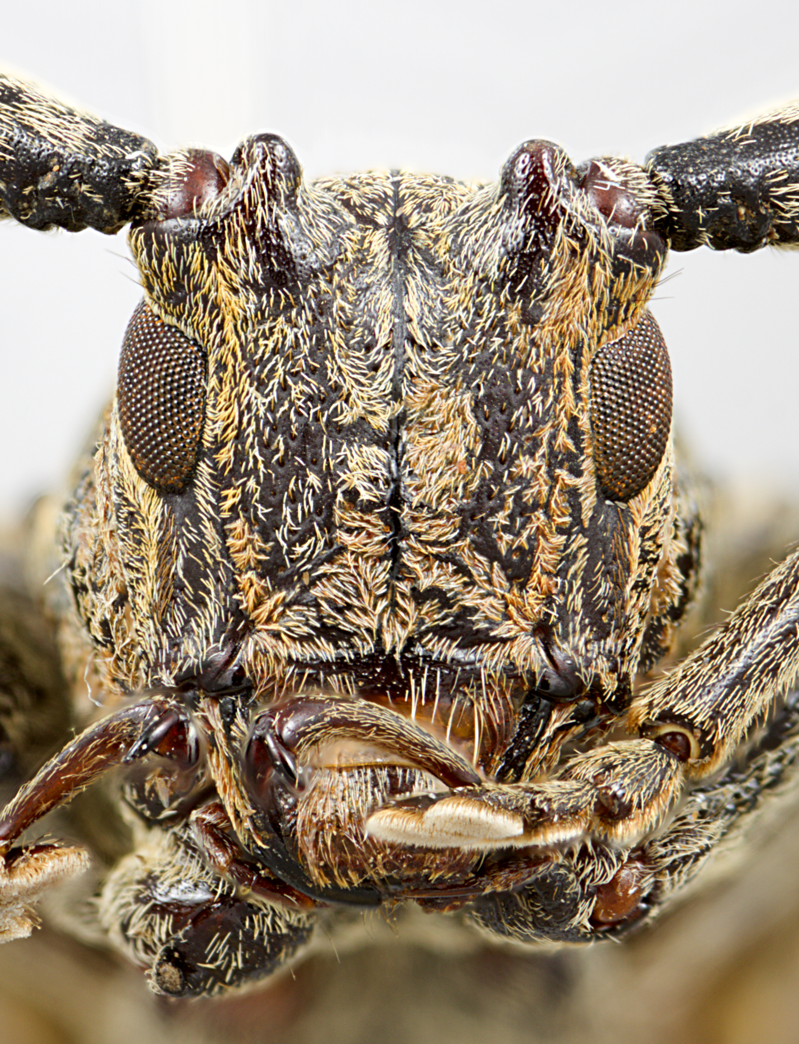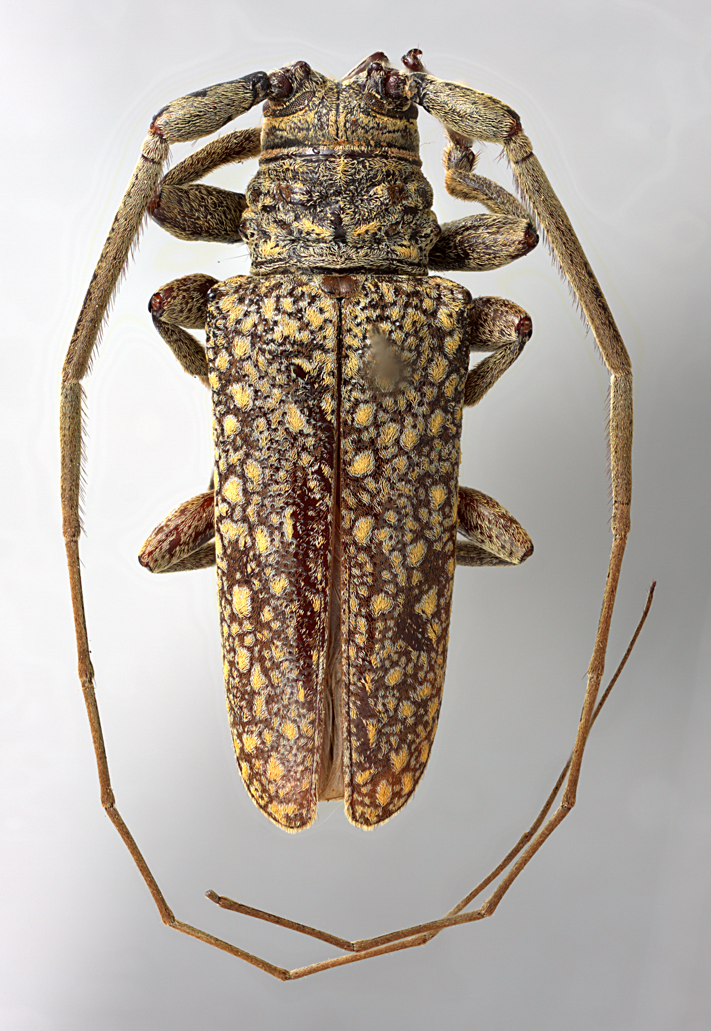Elongate-oblong, moderate-sized, about 18 mm in length. Integument generally dark brown with whitish and ochraceous pubescence. Head with frons subquadrate to elongate, about as wide as width of 3–4 lower eye lobes. Eyes with lower lobes ovate to distinctly narrow. Genae elongate, about as tall to distinctly taller than lower eye lobes. Antennal tubercles prominent, widely separated; tubercles not armed at apex or armed with a small projection, or with a short, blunt horn (males). Antennae distinctly longer than overall body length, as much as twice as long; scape clavate, shorter than antennomere IV; antennomere III curved or sinuate, longer than scape and antennomere IV; antennomere XI shorter than X (females) or longer than X (males). Pronotum strongly transverse, roughly conical, wider at base, with lateral tubercles. Elytra with sides roughly parallel to attenuate; elytral apices individually rounded; elytra generally speckled; base of elytra with two prominent tubercles at humeri. Basal 1/3 of elytra with dense punctation, surface granulate-punctate. Procoxae without projection (females) or with distinct, curved hook (males). Mesosternal process with apex feebly to deeply emarginate. Metafemora moderate to short in length, about 1/3–1/4 as long as elytra.