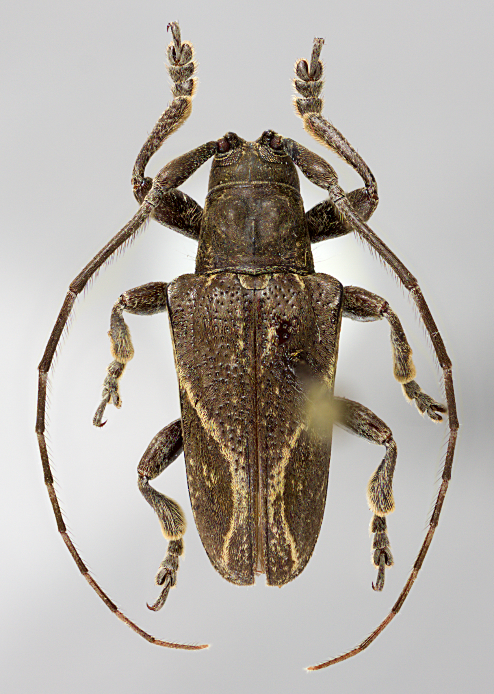Elongate-oblong, small to moderate-sized, ranging from about 9–13 mm in length. Integument generally dark brown or ferrugineous with whitish, ferrugineous, and ochraceous pubescence. Head with frons elongate, narrow, about as wide as width of 1–2 lower eye lobes. Eyes with lower lobes oblong. Genae elongate, about as tall to distinctly shorter than lower eye lobes. Antennal tubercles prominent, moderately separated; tubercles armed at apex with a small projection, or with a short, blunt horn. Antennae about as long as overall body length, or as much as 1 2/3 times as long; scape clavate, about as long or shorter than antennomere IV; antennomere III sinuate, longer than scape and antennomere IV. Pronotum transverse, roughly cylindrical to conical, wider at base, with or without lateral tubercles. Elytra with sides roughly parallel to slightly attenuate; elytral apices individually rounded; elytra generally uniform in coloration or speckled, or with distinct maculae; base of elytra with two prominent tubercles at humeri. Basal 1/3 of elytra with moderate punctation, surface coarsely punctate. Procoxae without projection (females) or with small acute projection or distinct, curved hook (males). Mesosternal process with apex deeply emarginate. Metafemora long to moderate in length, about 1/2–1/3 as long as elytra.