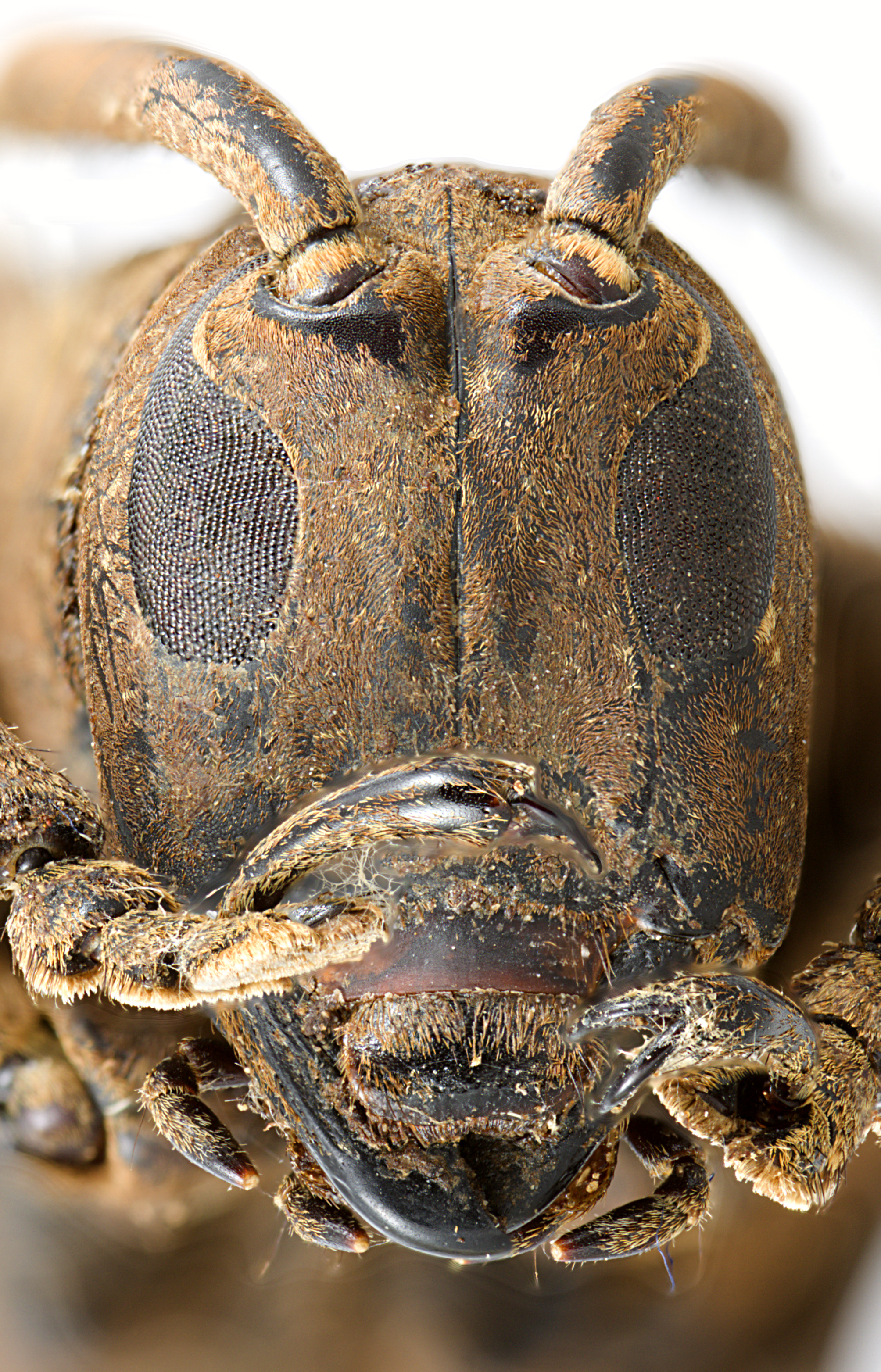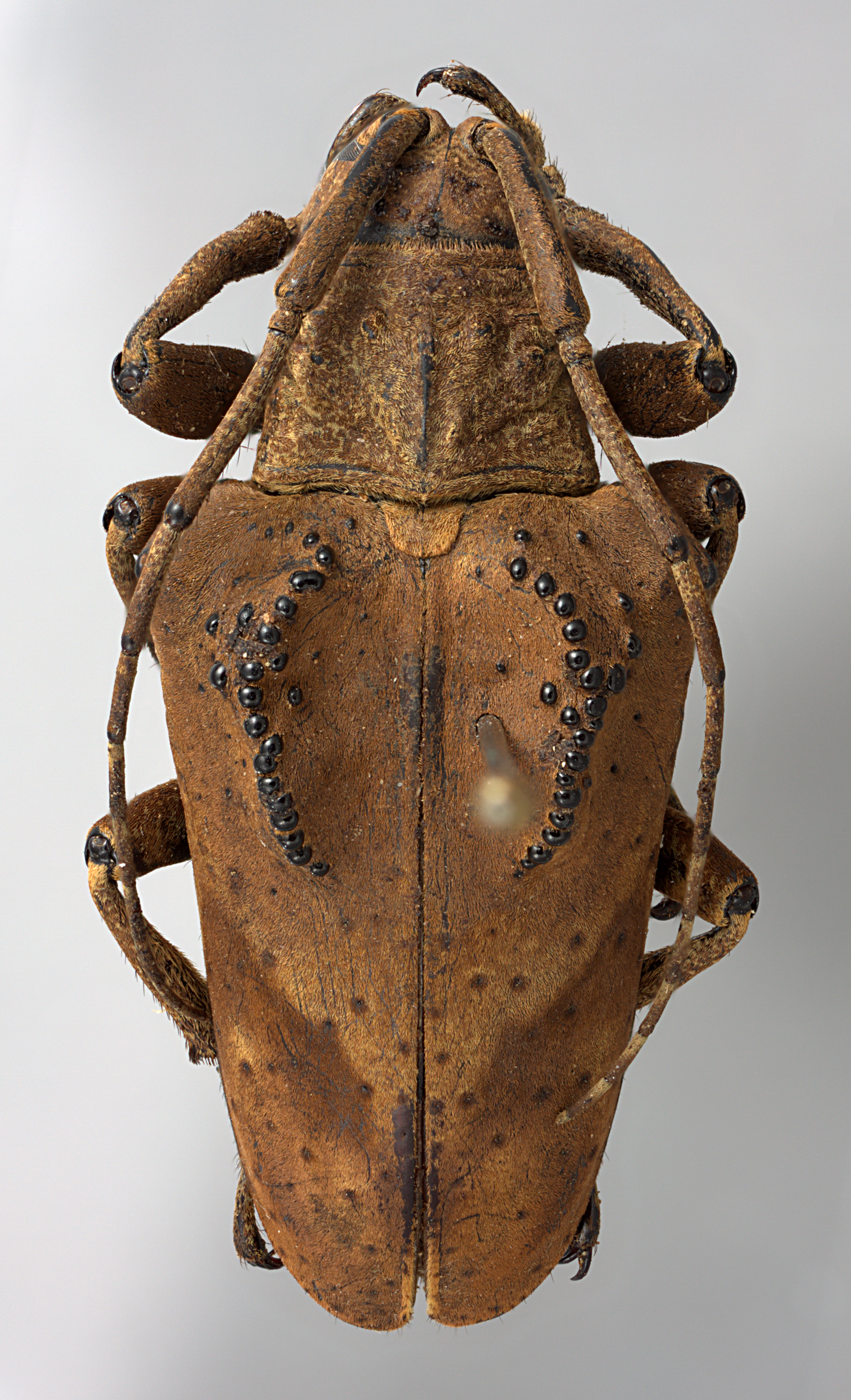Elongate-ovate, robust, moderate to large-sized, ranging from about 15–30 mm in length. Integument generally dark brown or black with brown, ferrugineous, and ochraceous pubescence. Head with frons elongate, about as wide as width of 1 1/2 to two lower eye lobes. Eyes with lower lobes large, oblong; area connecting upper and lower lobes taller than upper lobe. Genae elongate, about as tall to distinctly shorter than lower eye lobes. Antennal tubercles prominent, narrowly separated, contiguous at base; tubercles not armed at apex. Antennae distinctly shorter than overall body length (females), or about as long (males); scape bowed, gradually expanded to apex, longer than antennomere IV; antennomere III variable in shape, from nearly straight to curved to sinuate, about as long or shorter than scape and longer than antennomere IV. Pronotum transverse, strongly conical, wider at base, without lateral tubercles; pronotum with distinct, basal, transverse sulcus. Elytra with sides strongly attenuate; elytral apices individually rounded; elytra generally uniformly brownish; base of elytra with two obtuse tubercles at humeri as well as two longitudinal, arcuate, strongly elevated crests, each crest studded with several round, shiny tubercles. Basal 1/3 of elytra without punctation. Procoxae without projection. Mesocoxae with distinct, obtuse tubercle. Mesosternal process with apex deeply emarginate. Metafemora long to moderate in length, about 1/2–1/3 as long as elytra.
