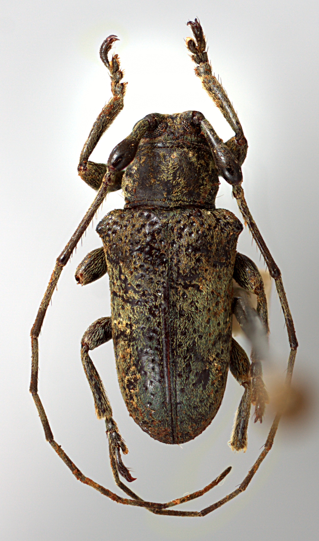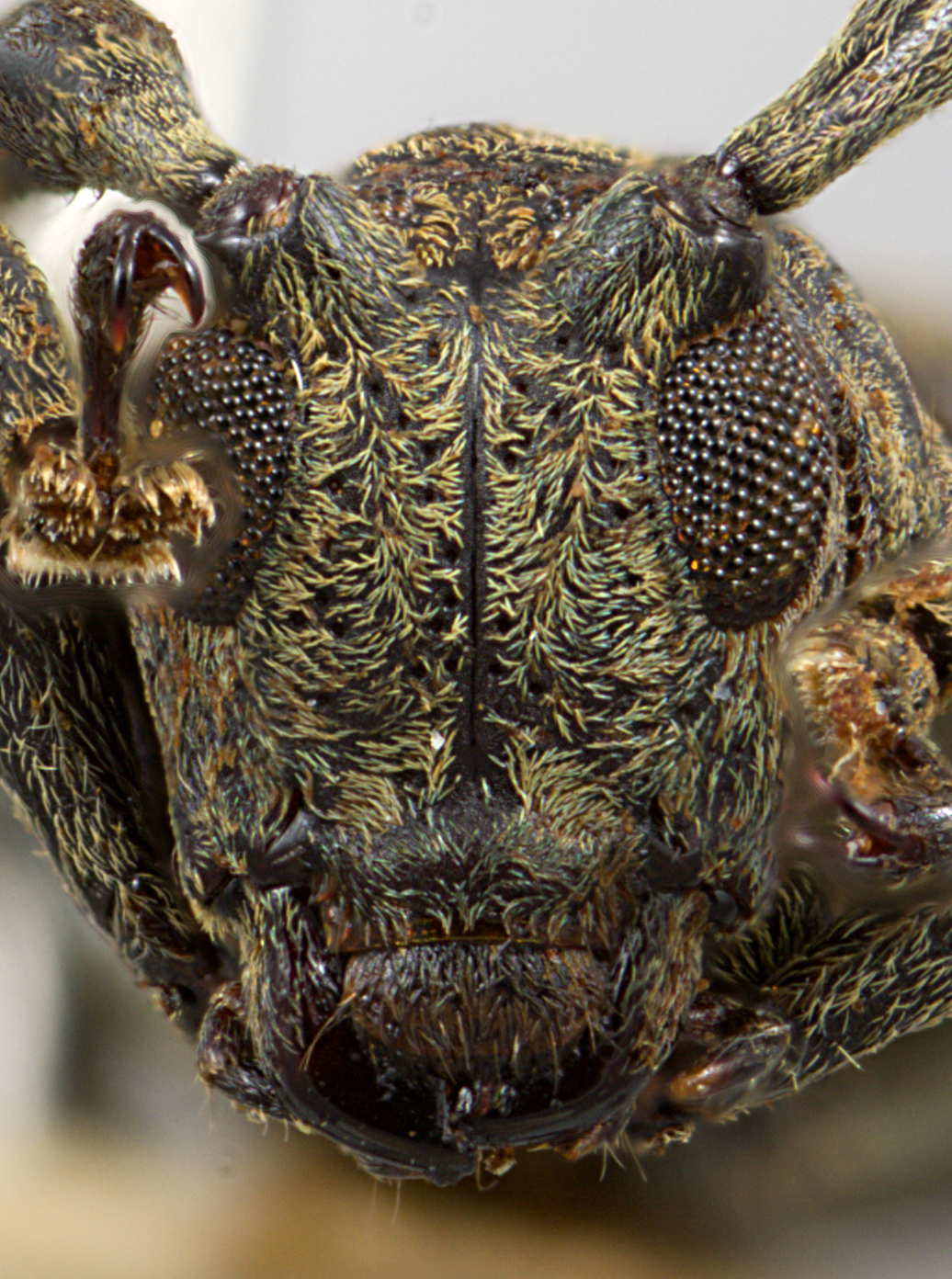 Elongate-ovate, small-sized, ranging from about 7–9 mm in length. Integument generally dark brown with greenish and ochraceous pubescence. Head with frons elongate, about as wide as width of two lower eye lobes. Eyes with lower lobes ovate. Genae elongate, about as tall as lower eye lobes. Antennal tubercles prominent, moderately separated; tubercles not armed at apex. Antennae about as long as overall body length, or about twice as long; scape clavate, about as long or shorter than antennomere IV; antennomere III sinuate, longer than scape and antennomere IV. Pronotum transverse, roughly cylindrical or conical, wider at base, without lateral tubercles. Elytra with sides attenuate; elytral apices individually or jointly rounded; elytra generally uniform in coloration; base of elytra with two prominent tubercles at humeri. Basal 1/3 of elytra with moderate to dense punctation, surface coarsely punctate to granulate-punctate. Procoxae without projection. Mesosternal process with apex feebly emarginate. Metafemora long or moderate in length, about 1/2–1/3 as long as elytra.