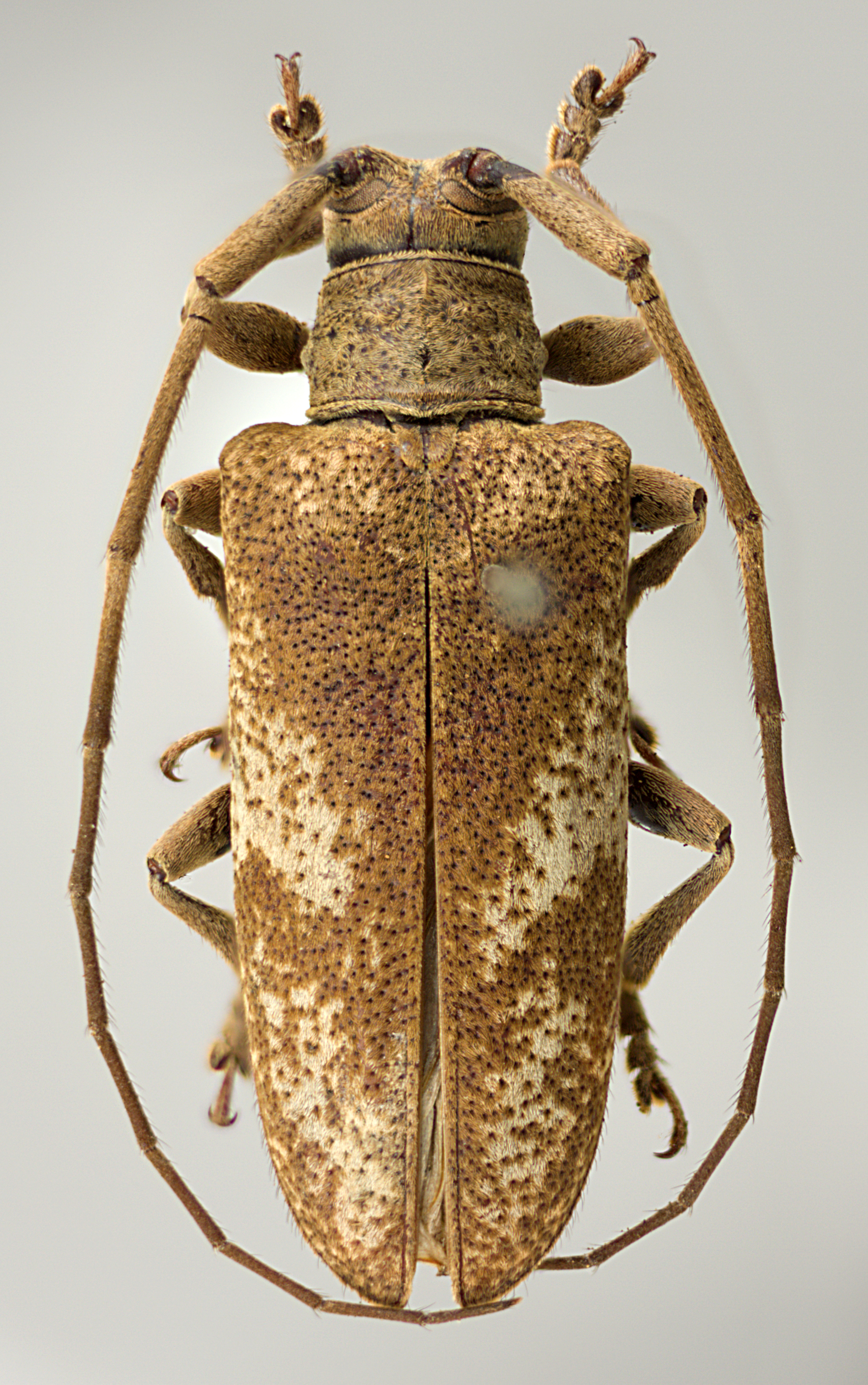 Elongate-oblong, moderate to large-sized, ranging from about 14–23 mm in length. Integument generally dark brown with whitish, ferrugineous, and ochraceous pubescence. Head with frons subquadrate, about as wide as width of two lower eye lobes. Eyes with lower lobes oblong. Genae elongate, distinctly shorter than lower eye lobes. Antennal tubercles prominent, widely separated; tubercles not armed at apex. Antennae about as long as overall body length, or as much as 1 1/3 times as long; scape gradually expanded to apex, about as long as antennomere IV; antennomere III curved, longer than scape and antennomere IV. Pronotum transverse, roughly cylindrical to conical, wider at base, without lateral tubercles. Elytra with sides roughly parallel; elytral apices individually rounded; elytra generally uniform in coloration or speckled, or with distinct maculae; base of elytra without prominent tubercles at humeri. Basal 1/3 of elytra with dense punctation, surface coarsely punctate to granulate-punctate. Procoxae without projection. Mesosternal process with apex subtruncate to feebly emarginate. Metafemora moderate to short in length, about 1/3–1/4 as long as elytra.