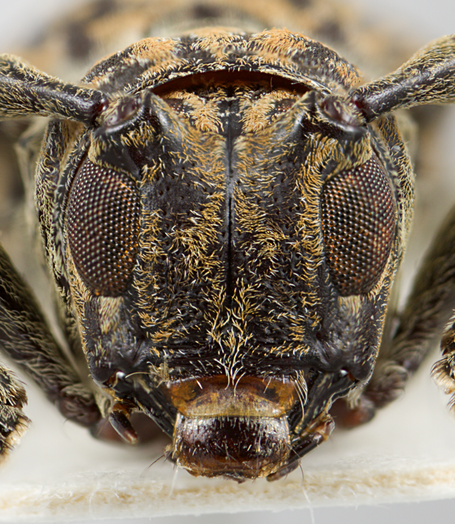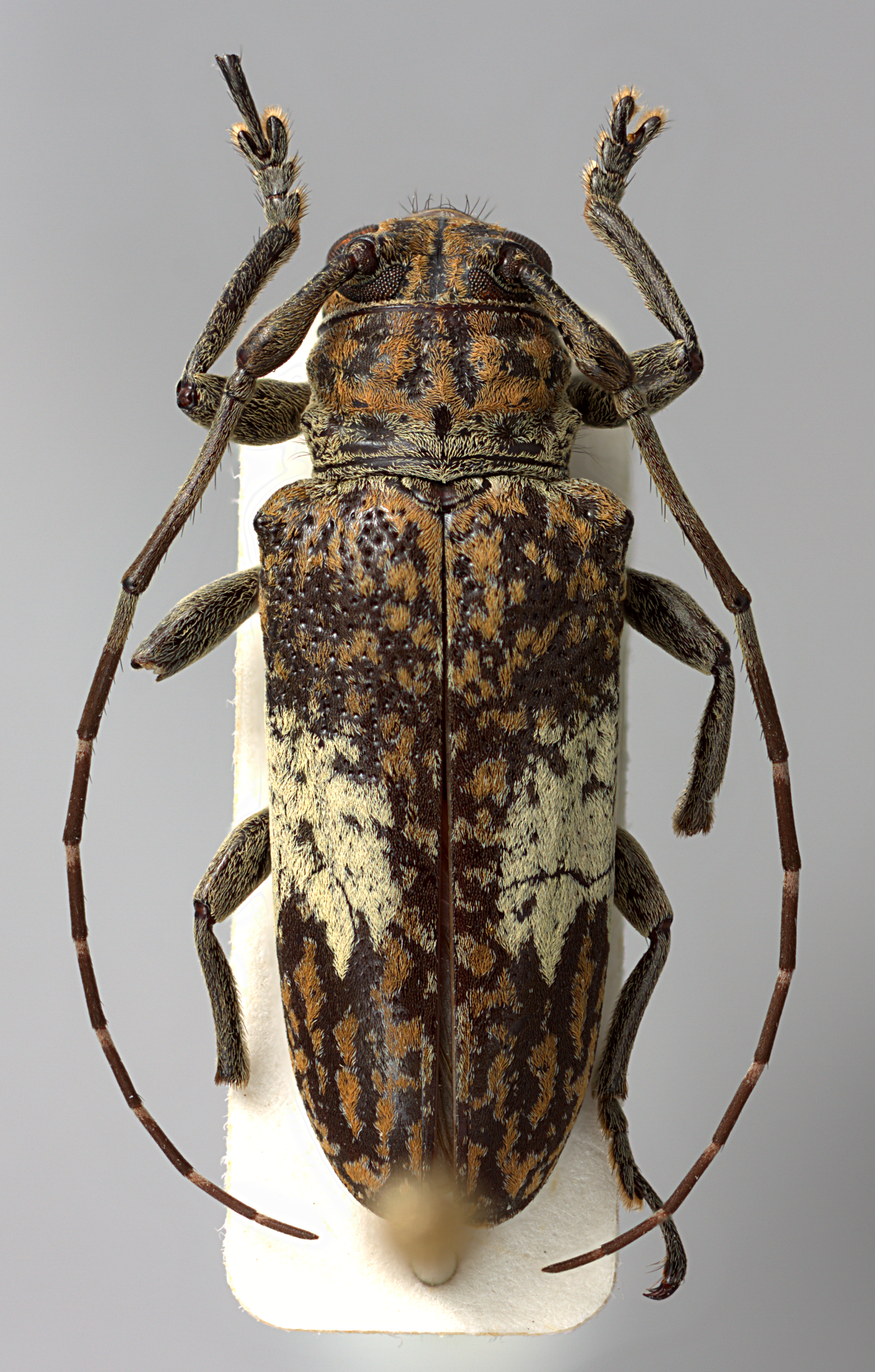 Elongate-oblong, small to moderate-sized, ranging from about 11–15 mm in length. Integument generally dark brown with whitish, ferrugineous, and ochraceous pubescence. Head with frons subquadrate to elongate, about as wide as width of two lower eye lobes. Eyes with lower lobes ovate-oblong. Genae subquadrate, distinctly shorter than lower eye lobes. Antennal tubercles prominent, widely separated; tubercles not armed at apex or armed with a small projection, or with a short, blunt horn. Antennae about as long as overall body length, or as much as twice as long; scape clavate, shorter than antennomere IV; antennomere III sinuate, longer than scape and antennomere IV; antennomere XI shorter than X (females) or longer than X (males). Pronotum transverse, roughly cylindrical to conical, wider at base, with lateral tubercles. Elytra with sides roughly parallel to slightly attenuate; elytral apices individually rounded; elytra distinct maculae; base of elytra with two prominent tubercles at humeri. Basal 1/3 of elytra with moderate to dense punctation, surface coarsely punctate to granulate-punctate. Procoxae without projection or with an obtuse tubercle (males). Mesosternal process with apex feebly emarginate. Metafemora moderate to short in length, about 1/3–1/4 as long as elytra.