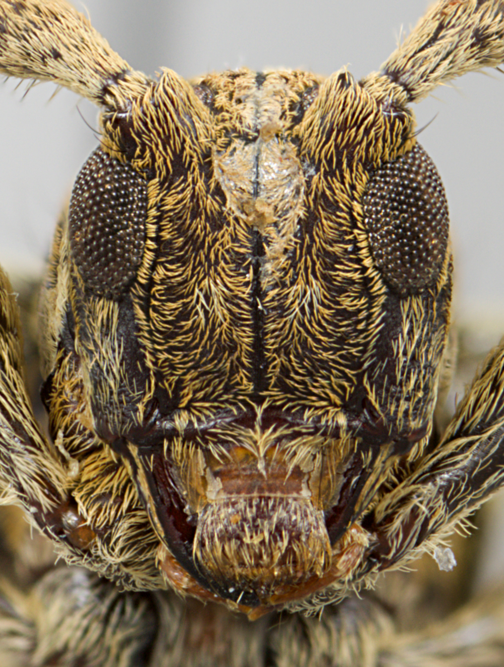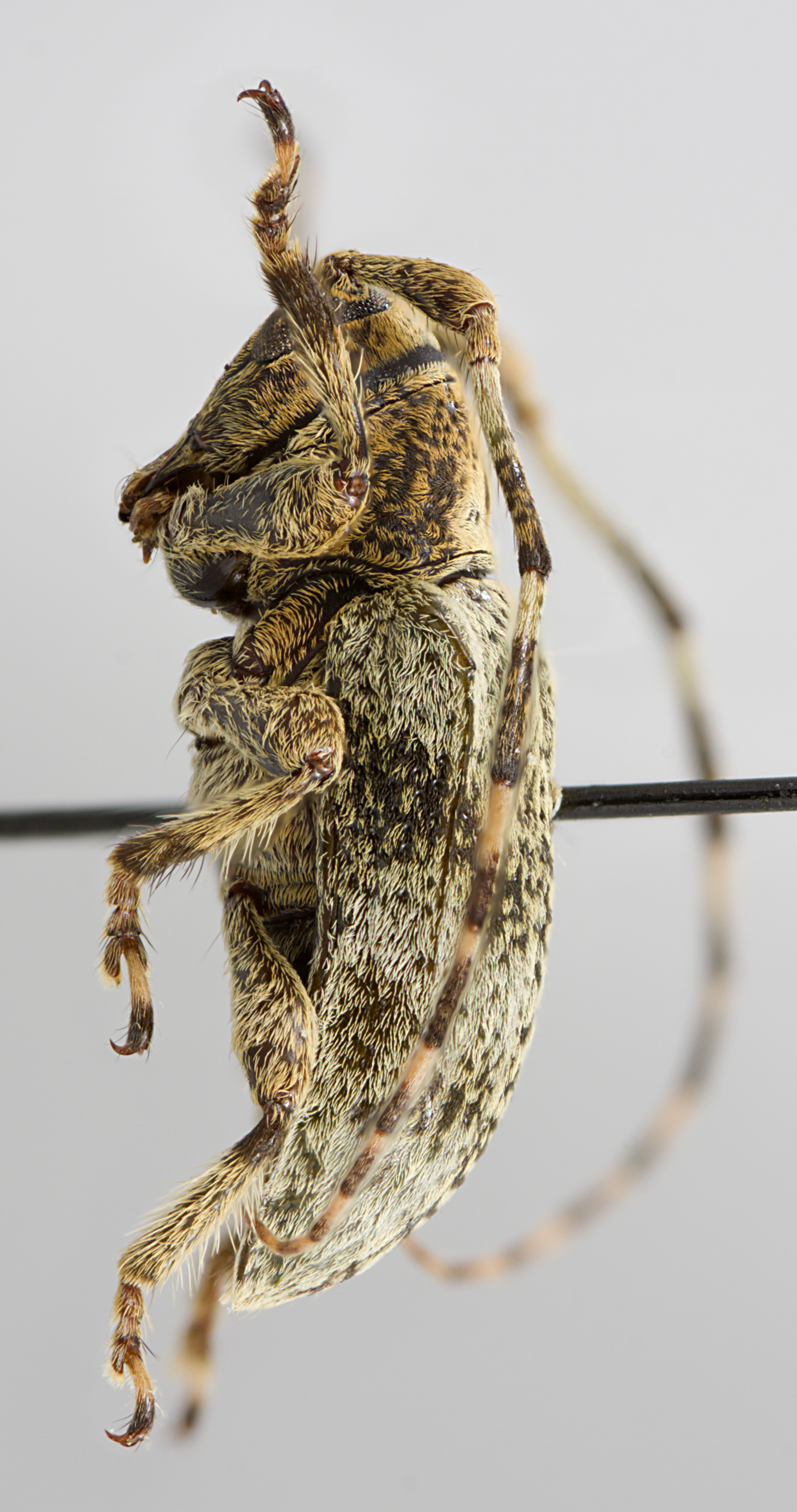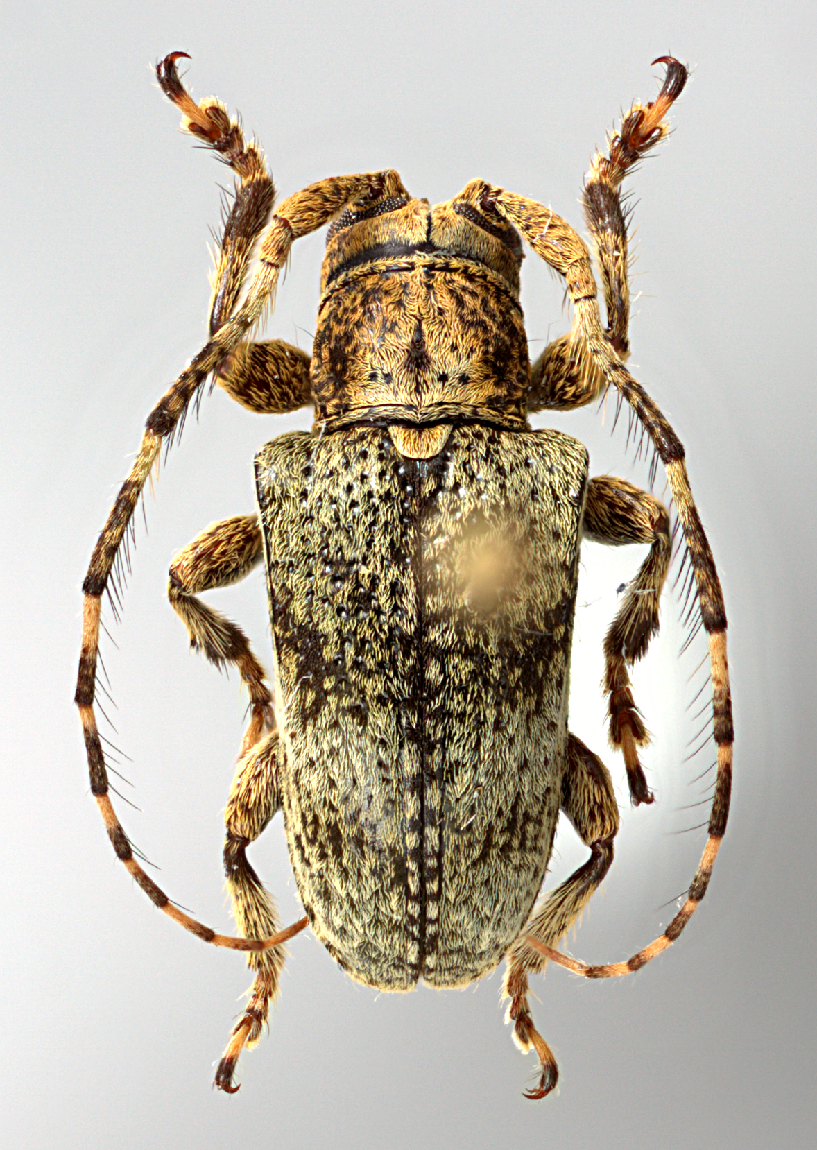 Elongate-ovate, small-sized, ranging from about 7–10 mm in length. Integument generally dark brown with whitish, ferrugineous, and ochraceous pubescence. Head with frons elongate, about as wide as width of two lower eye lobes. Eyes with lower lobes ovate. Genae elongate, taller than lower eye lobes. Antennal tubercles prominent, moderately separated; tubercles not armed at apex or armed with a small projection, or with a short, blunt horn. Antennae about as long as overall body length, or as much as 1 1/3 times as long; scape clavate, shorter than antennomere IV; antennomere III sinuate, longer than scape and antennomere IV. Pronotum transverse, roughly cylindrical to conical, wider at base, without lateral tubercles. Elytra with sides attenuate; elytral apices individually rounded; elytra generally uniform in coloration or speckled, or with distinct maculae; base of elytra with two prominent ridges at humeri. Basal 1/3 of elytra with dense punctation, surface coarsely punctate to granulate-punctate. Procoxae without projection. Mesosternal process with apex subtruncate to feebly emarginate. Metafemora moderate in length, about 1/3 as long as elytra.
