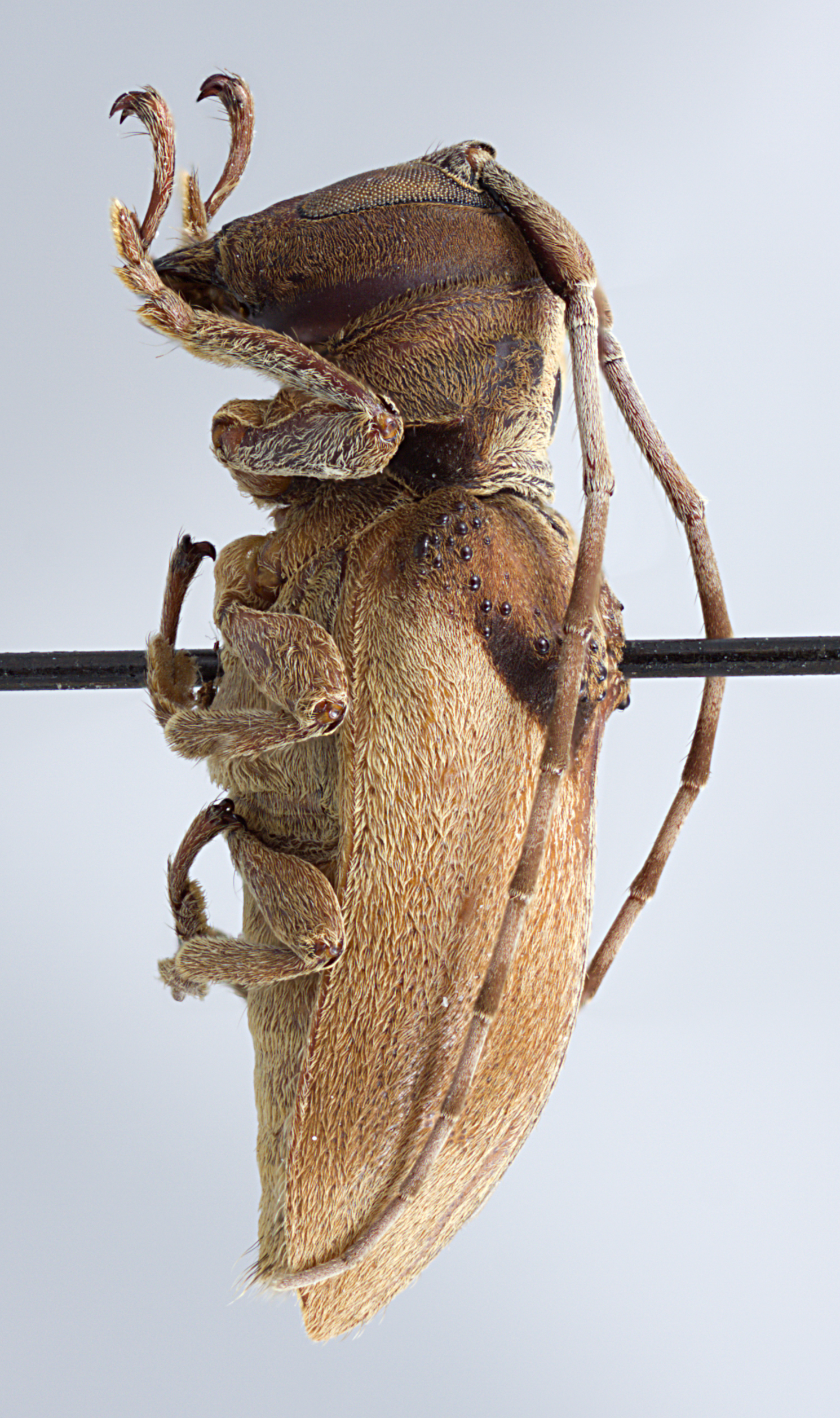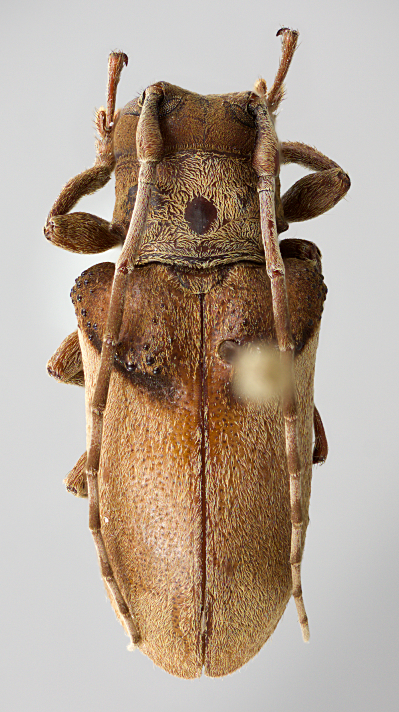Elongate-ovate, moderate sized, about 14–15 mm in length. Integument generally dark brown or ferrugineous with whitish, ferrugineous, and ochraceous pubescence. Head with frons elongate, about as wide as width of two lower eye lobes. Eyes with lower lobes large, oblong. Genae with subquadrate to slightly transverse, distinctly shorter than lower eye lobes. Antennal tubercles prominent, widely separated; tubercles not armed at apex (females) or armed with a small projection (males). Antennae about as long as overall body length; scape clavate, about as long as antennomere IV; antennomere III slightly curved, longer than scape and antennomere IV. Pronotum strongly transverse, roughly cylindrical to conical, slightly narrower at base, with acute, lateral tubercles; pronotal disk with distinct glabrous area at center. Elytra with sides slightly attenuate; elytral apices individually rounded; elytra generally uniform in coloration; base of elytra with several round, shiny tubercles at humeri; tubercles extending along an arcuate, strongly elevated crest to basal 1/3 of elytra. Basal 1/3 of elytra without punctation or with dense punctation, surface finely punctate. Procoxae without projection. Mesosternal process with apex feebly to deeply emarginate. Metafemora moderate to short in length, about 1/3–1/4 as long as elytra.