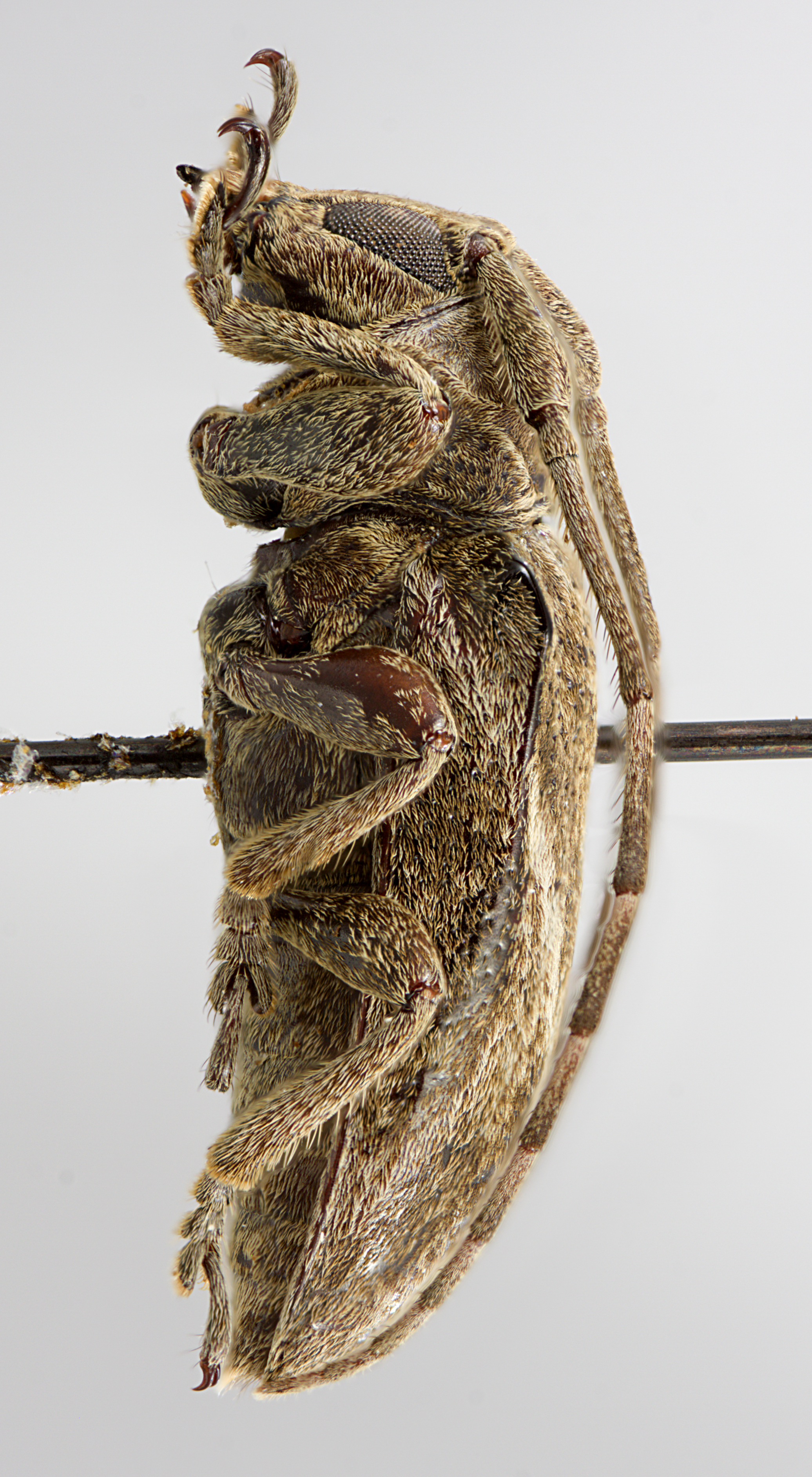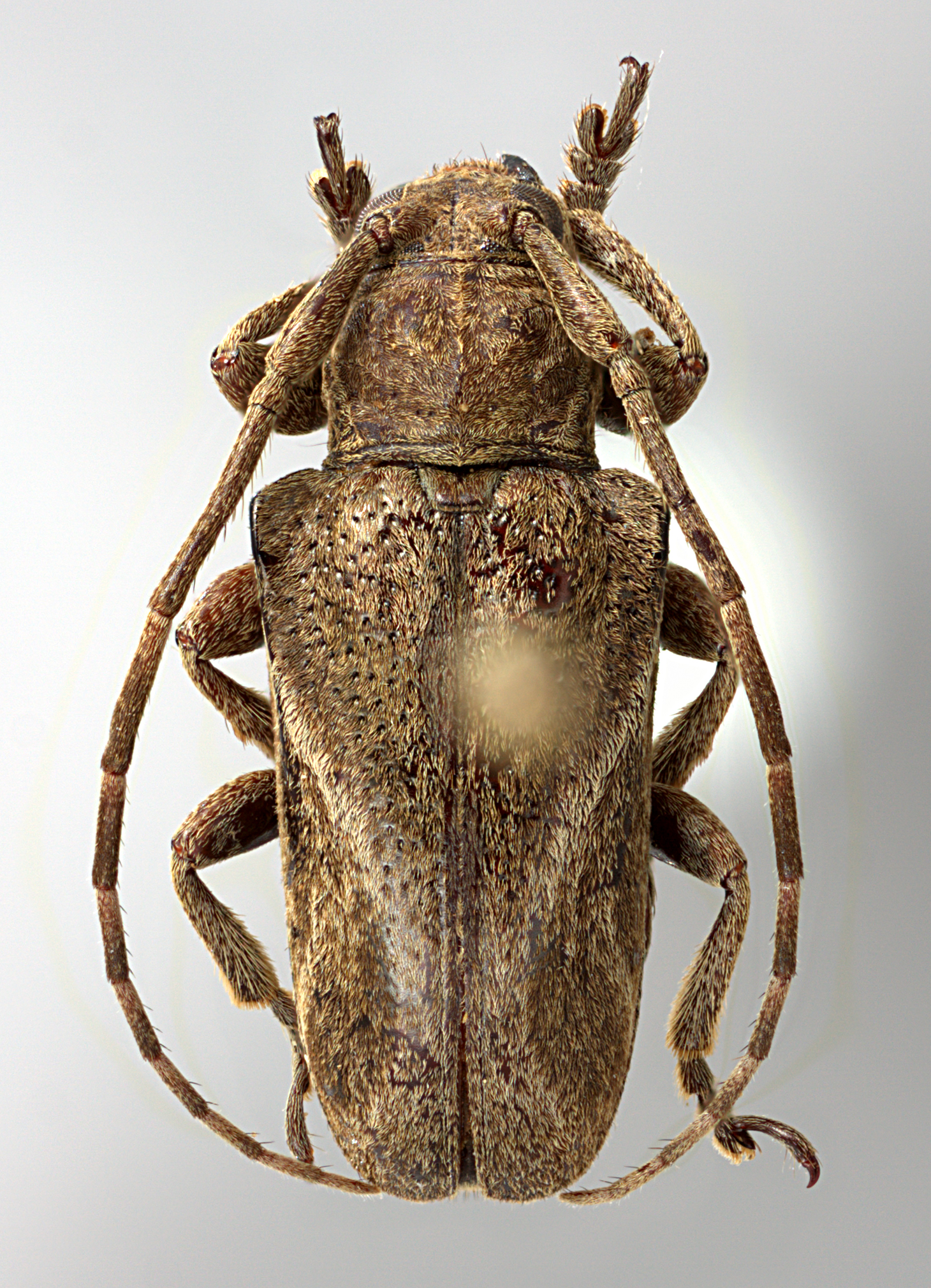 Elongate-oblong, small-sized, ranging from about 9–11 mm in length. Integument generally dark brown with whitish, ferrugineous, and ochraceous pubescence. Head with frons elongate, about as wide as width of nearly two lower eye lobes. Eyes with lower lobes large, oblong. Genae subquadrate to elongate, distinctly shorter than lower eye lobes. Antennal tubercles prominent, moderately separated; tubercles armed at apex with a small projection. Antennae about as long as overall body length, or as much as 1 1/3 times as long; scape clavate, about as long as antennomere IV; antennomere III sinuate, longer than scape and antennomere IV. Pronotum transverse, roughly cylindrical, without lateral tubercles. Elytra with sides roughly parallel; elytral apices individually rounded; elytra generally uniform in coloration or speckled, or with distinct transverse lines; base of elytra with two prominent tubercles at humeri. Basal 1/3 of elytra with dense punctation, surface coarsely punctate to granulate-punctate. Procoxae without projection or with small acute projection or an obtuse tubercle. Mesosternal process with apex feebly to deeply emarginate. Metafemora moderate to short in length, about 1/3–1/4 as long as elytra.