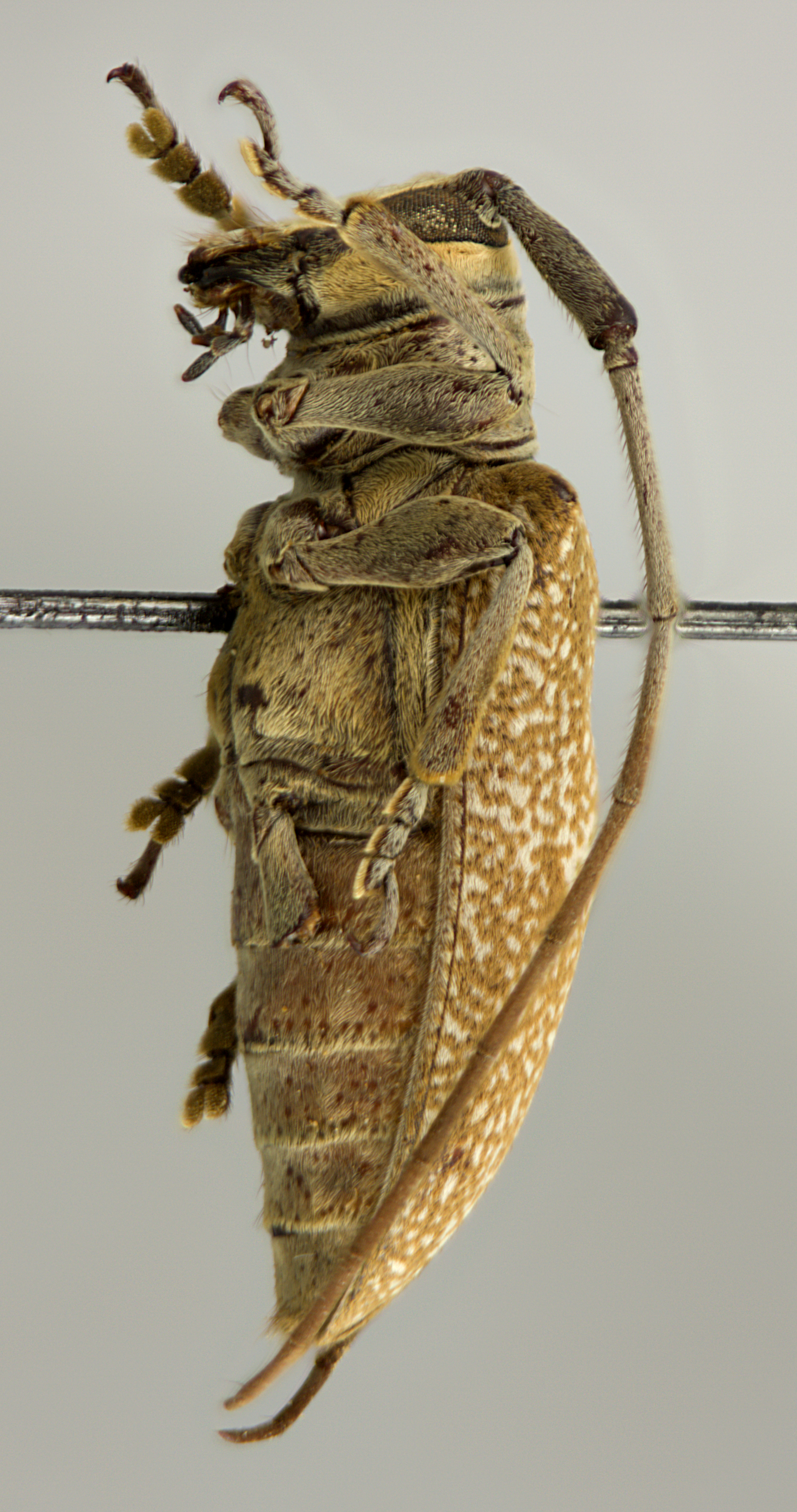 Elongate-oblong, moderate to large-sized, ranging from about 10–22 mm in length. Integument generally dark brown or ferrugineous with whitish, ferrugineous, and ochraceous pubescence. Head with frons subquadrate, about as wide as width of 2 1/2 lower eye lobes. Eyes with lower lobes oblong. Genae transverse, distinctly shorter than lower eye lobes. Antennal tubercles prominent, widely separated; tubercles not armed at apex. Antennae about as long as overall body length, or as much as 1 1/3 times as long; scape gradually expanded to apex, about as long or longer than antennomere IV; antennomere III nearly straight or curved, longer than scape and antennomere IV. Pronotum transverse, roughly cylindrical, with or without lateral tubercles. Elytra with sides roughly parallel; elytral apices individually rounded; elytra generally uniform in coloration or speckled; base of elytra without tubercles or with two prominent tubercles at humeri. Basal 1/3 of elytra with moderate to dense punctation, surface finely punctate or coarsely punctate. Procoxae without projection. Mesosternal process with apex subtruncate. Metafemora moderate to short in length, about 1/3–1/4 as long as elytra.