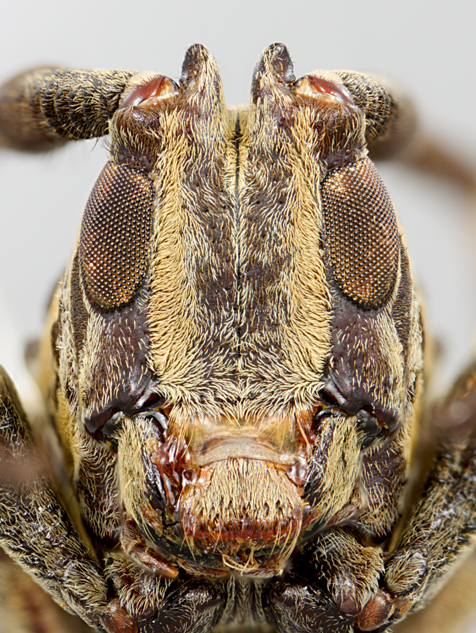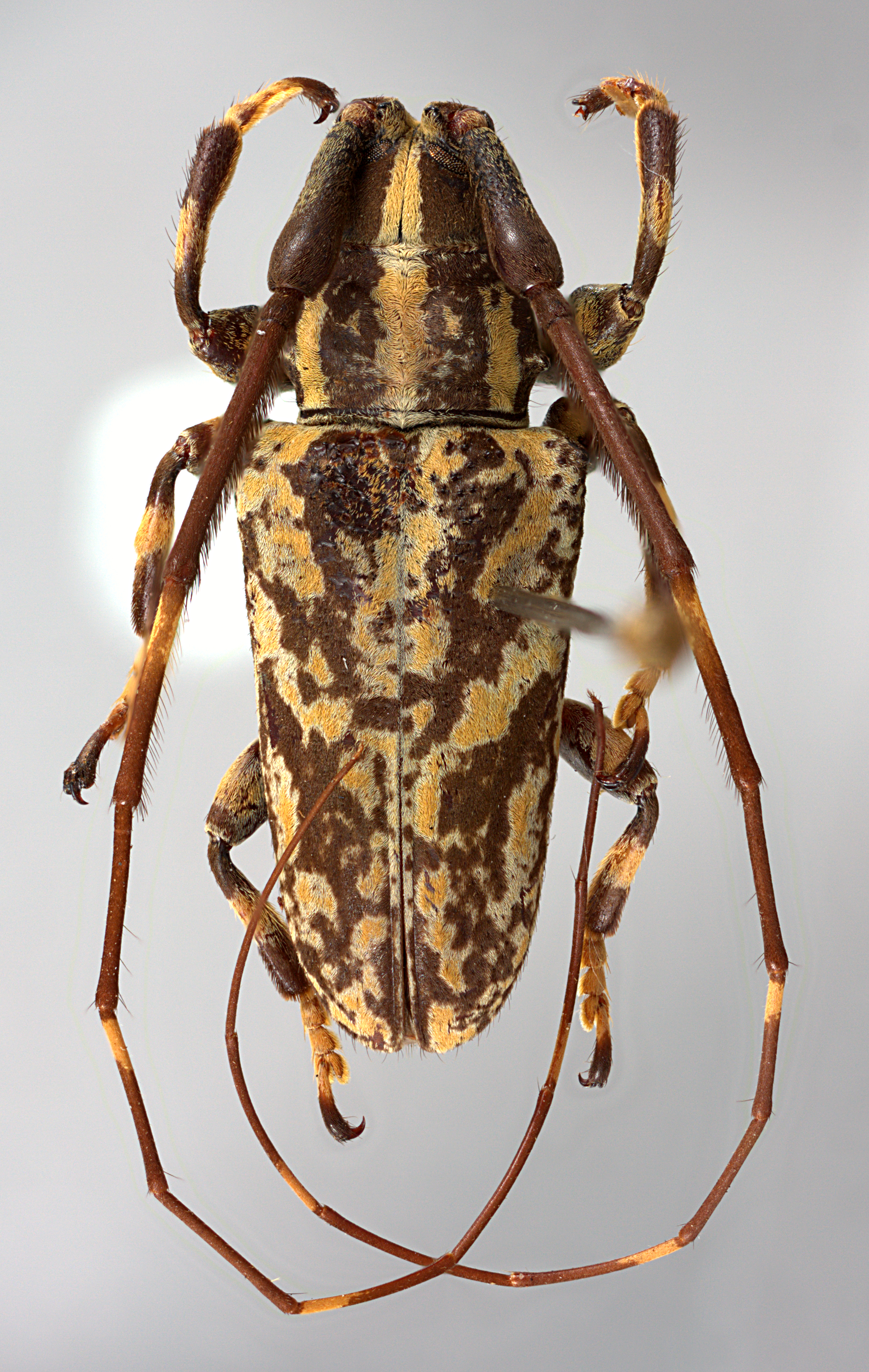 Elongate-oblong, moderate-sized, ranging from about 13–19 mm in length. Integument generally dark brown or ferrugineous with whitish, ferrugineous, and ochraceous pubescence. Head with frons elongate, about as wide as width of two lower eye lobes. Eyes with lower lobes oblong. Genae elongate, distinctly shorter than lower eye lobes. Antennal tubercles prominent, narrowly separated, contiguous at base; tubercles armed at apex with a small projection, or with a short, blunt horn. Antennae distinctly longer than body length, as much as twice as long; scape clavate, about as long or shorter than antennomere IV; antennomere III nearly straight or curved, longer than scape and antennomere IV, densely fimbriate beneath; antennomere XI shorter than X (females) or longer than X (males). Pronotum transverse, roughly cylindrical to conical, wider at base, with lateral tubercles. Elytra with sides roughly parallel to attenuate; elytral apices individually rounded; elytra with distinct maculae; base of elytra with two prominent tubercles at humeri. Basal 1/3 of elytra with moderate to dense punctation, surface coarsely punctate or granulate-punctate. Procoxae without projection or with an obtuse tubercle. Mesosternal process with apex deeply emarginate. Metafemora moderate to short in length, about 1/3–1/4 as long as elytra.