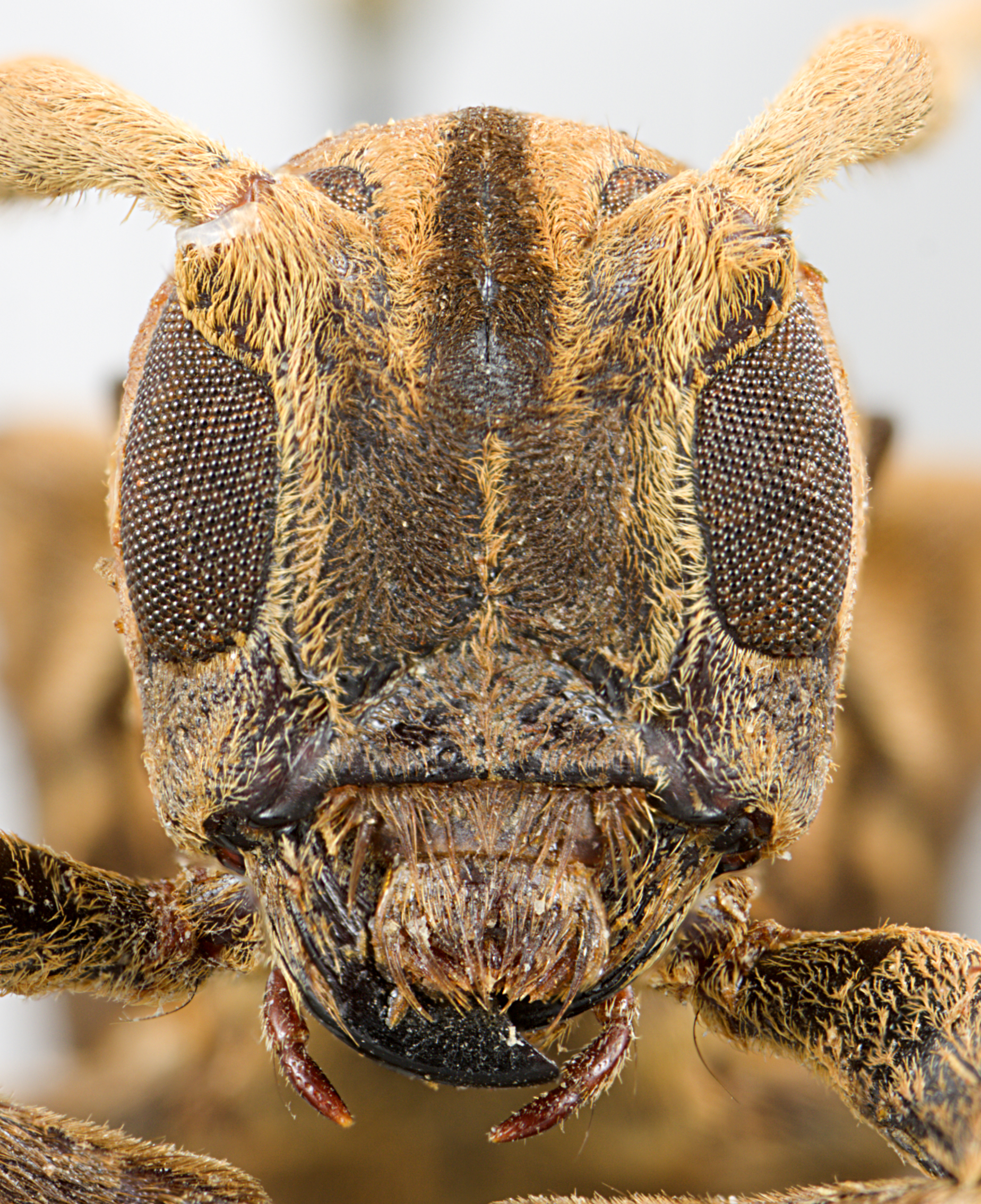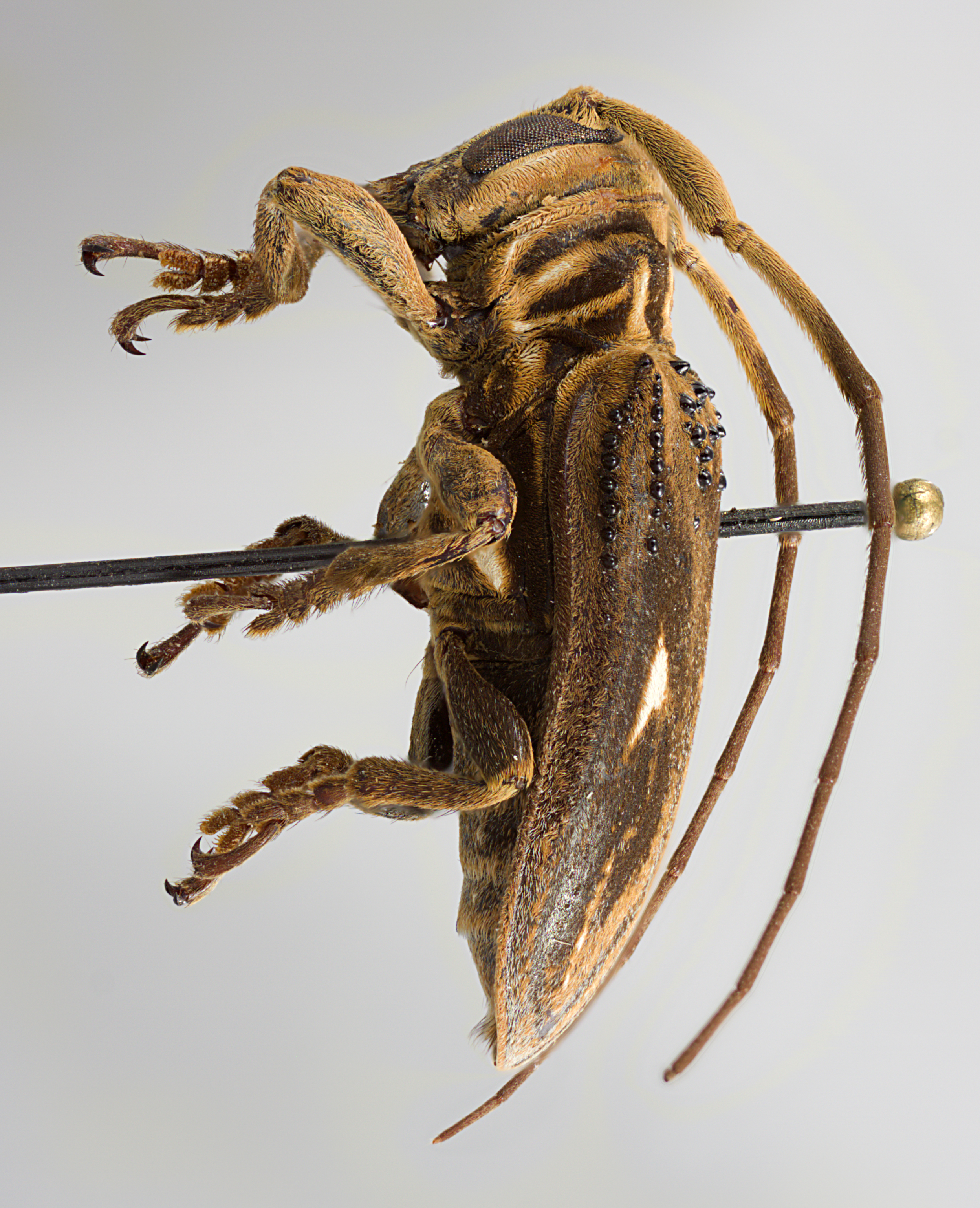 Elongate-oblong, moderate-sized, about 19 mm in length. Integument generally dark brown with whitish, ferrugineous, brown, and ochraceous pubescence. Head with frons elongate, about as wide as width of two lower eye lobes. Eyes with lower lobes large, oblong. Genae transverse, distinctly shorter than lower eye lobes. Antennal tubercles prominent, widely separated; tubercles not armed at apex or armed with a short, blunt horn. Antennae distinctly longer than overall body length, as much as 1 1/3 times as long; scape gradually expanded at apex, longer than antennomere IV; antennomere III curved, longer than scape and antennomere IV. Pronotum transverse, conical, wider at apex, with lateral tubercles. Elytra with sides roughly parallel; elytral apices jointly rounded; elytra with distinct maculae; base of elytra with several prominent, shiny tubercles at humeri. Basal 1/3 of elytra without punctation. Procoxae without projection. Mesosternal process with apex feebly emarginate. Metafemora moderate to short in length, about 1/3–1/4 as long as elytra.