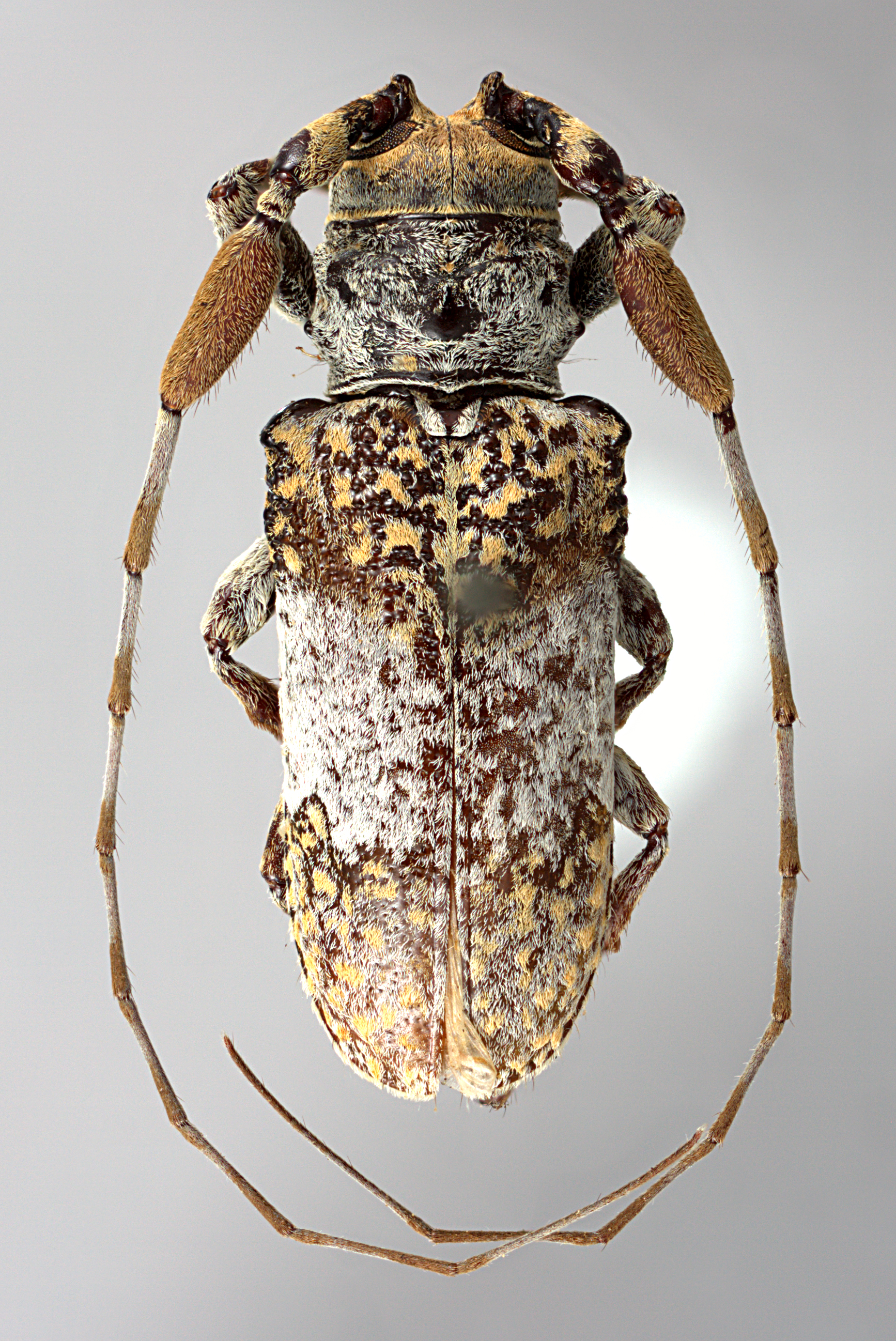 Elongate-oblong, small to moderate-sized, ranging from about 11–16 mm in length. Integument generally dark brown or black with whitish, ferrugineous, and ochraceous pubescence. Head with frons subquadrate to elongate, about as wide as width of three lower eye lobes. Eyes with lower lobes ovate-oblong. Genae elongate, about as tall or distinctly taller than lower eye lobes. Antennal tubercles prominent, moderately separated; tubercles not armed at apex or armed with a short, blunt horn. Antennae about as long as overall body length, or as much as twice as long; scape clavate, shorter than antennomere IV; antennomere III variable in shape and sexually dimorphic, from nearly straight to curved to sinuate (females) or strongly elliptical (males); antennomere III longer than scape and about as long or longer than antennomere IV; antennomere XI shorter than X (females) or longer than X (males). Pronotum transverse, roughly cylindrical to conical, distinctly narrower at base, with lateral tubercles; pronotal disk often with distinct glabrous area at center. Elytra with sides roughly parallel; elytral apices jointly rounded; elytra with distinct maculae; base of elytra with two prominent tubercles at humeri, often with several additional prominent, shiny tubercles. Basal 1/3 of elytra with dense punctation, surface granulate-punctate. Procoxae without projection or with an obtuse tubercle (males). Mesosternal process with apex subtruncate to feebly emarginate. Metafemora moderate to short in length, about 1/3–1/4 as long as elytra.