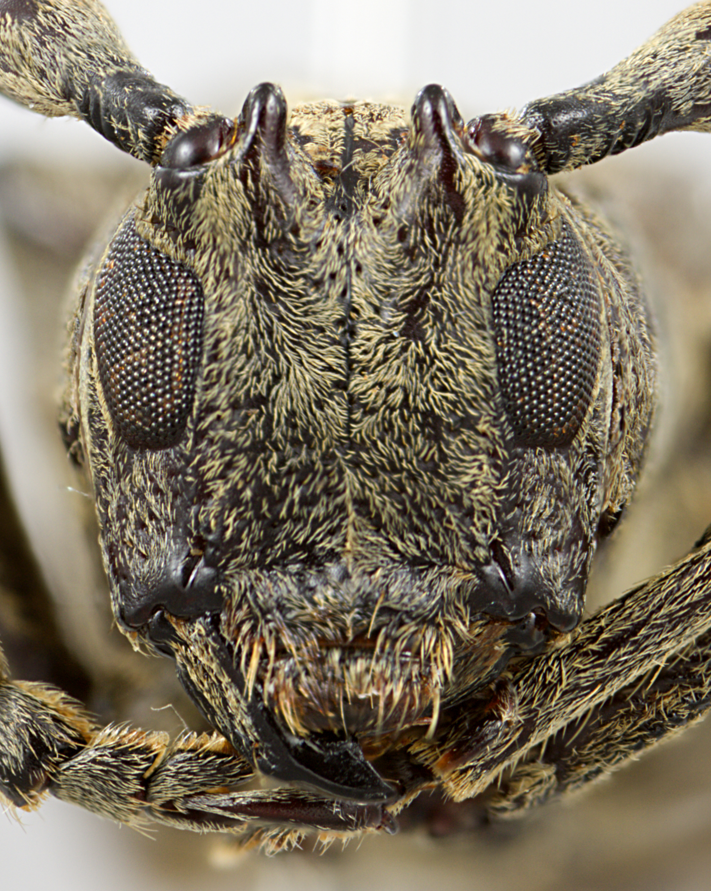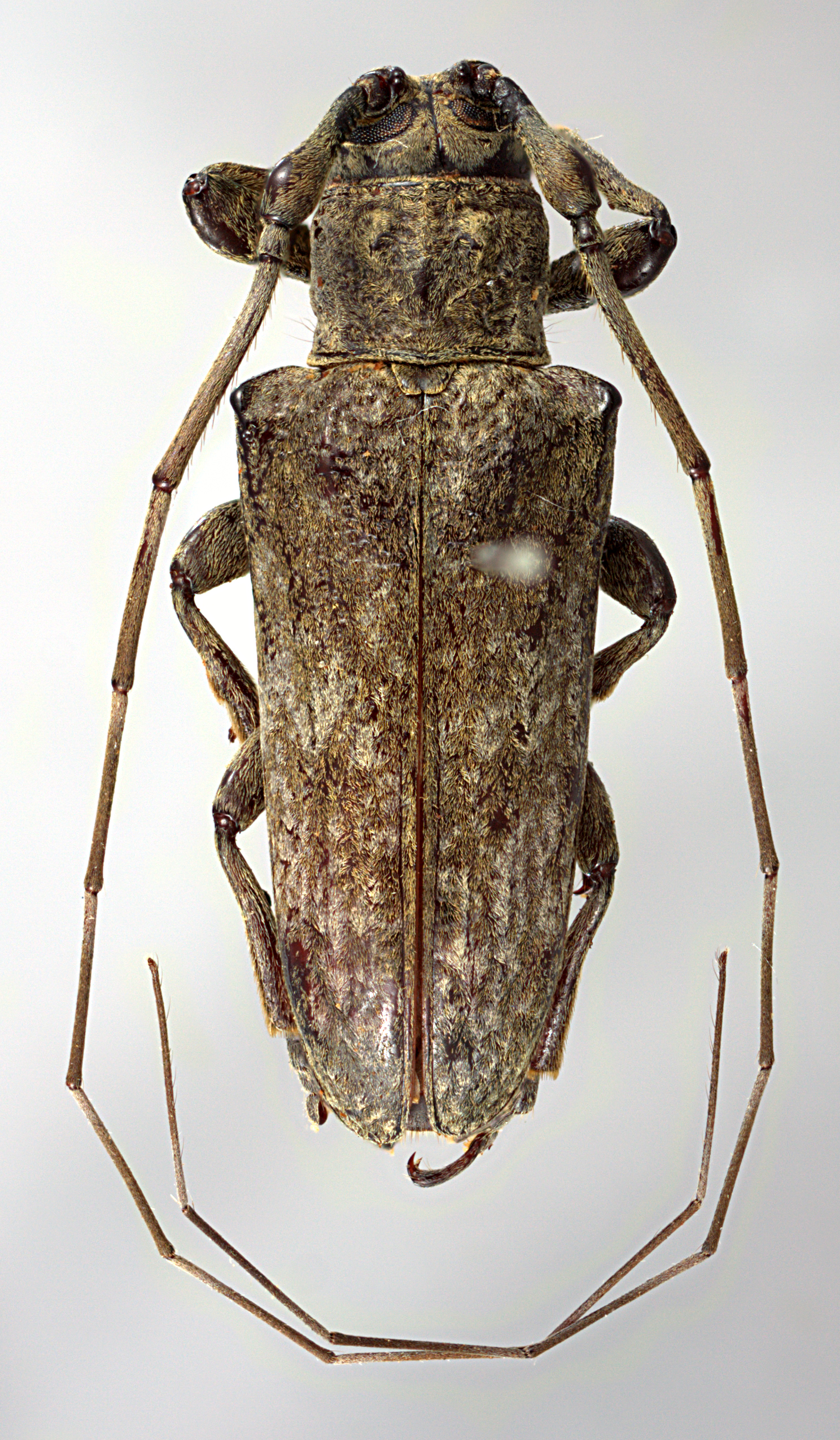 Elongate-oblong, moderate-sized, ranging from about 15–19 mm in length. Integument generally dark brown or black with whitish, ferrugineous, and ochraceous pubescence. Head with frons elongate, about as wide as width of two lower eye lobes. Eyes with lower lobes ovate-oblong. Genae elongate, about as tall or distinctly shorter than lower eye lobes. Antennal tubercles prominent, moderately to narrowly separated; tubercles not armed at apex or armed with a small projection, or with a short, blunt horn. Antennae distinctly longer than overall body length, as much as twice as long; scape clavate, about as long or shorter than antennomere IV; antennomere III sinuate, longer than scape and antennomere IV. Pronotum transverse, roughly cylindrical to conical, slightly wider at base, without lateral tubercles. Elytra with sides attenuate; elytral apices individually rounded; elytra generally uniform in coloration or speckled; base of elytra with two prominent tubercles at humeri. Basal 1/3 of elytra with dense punctation, surface coarsely punctate or granulate-punctate. Procoxae without projection or with distinct, curved hook. Mesosternal process with apex feebly to deeply emarginate. Metafemora moderate to short in length, about 1/3–1/4 as long as elytra.