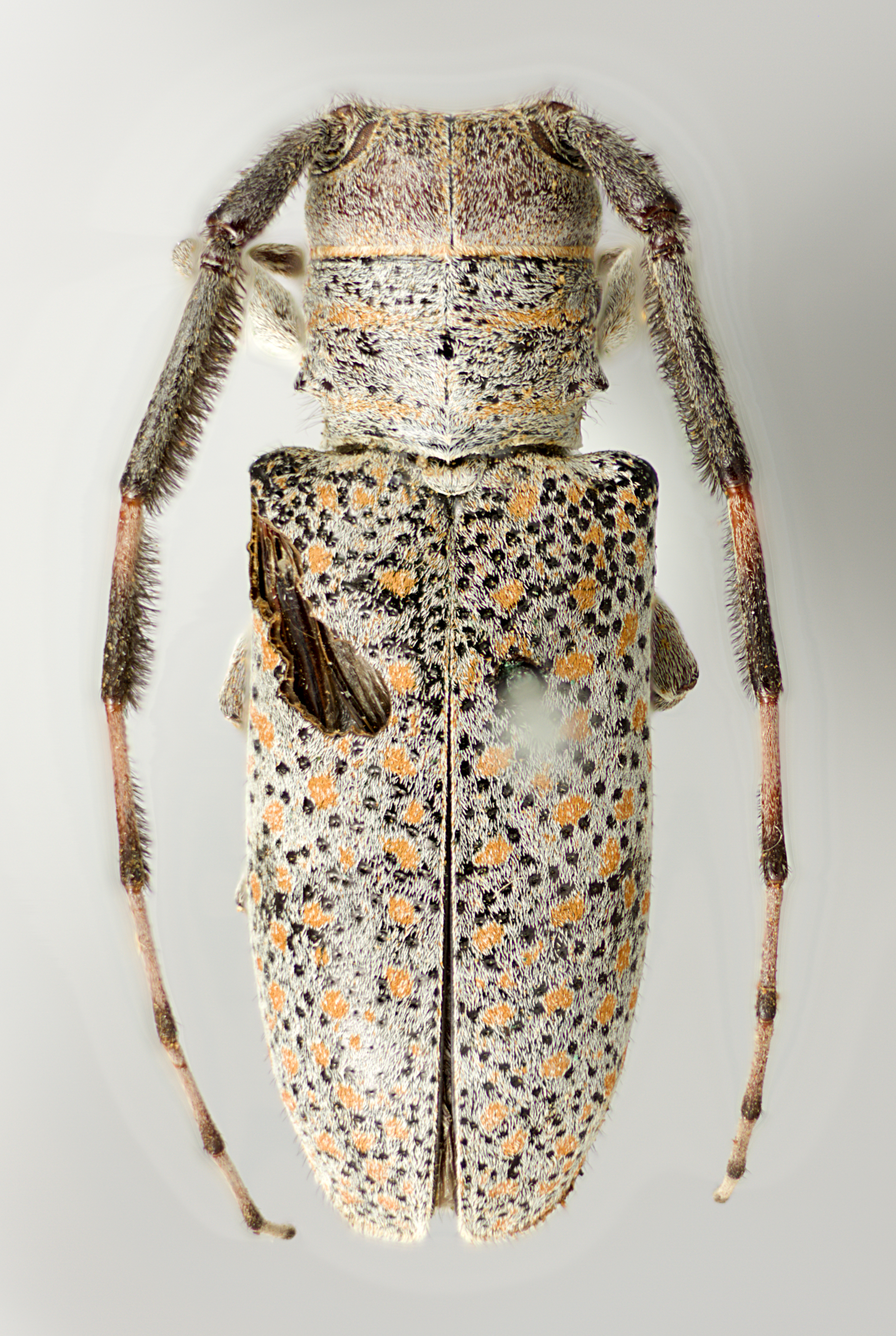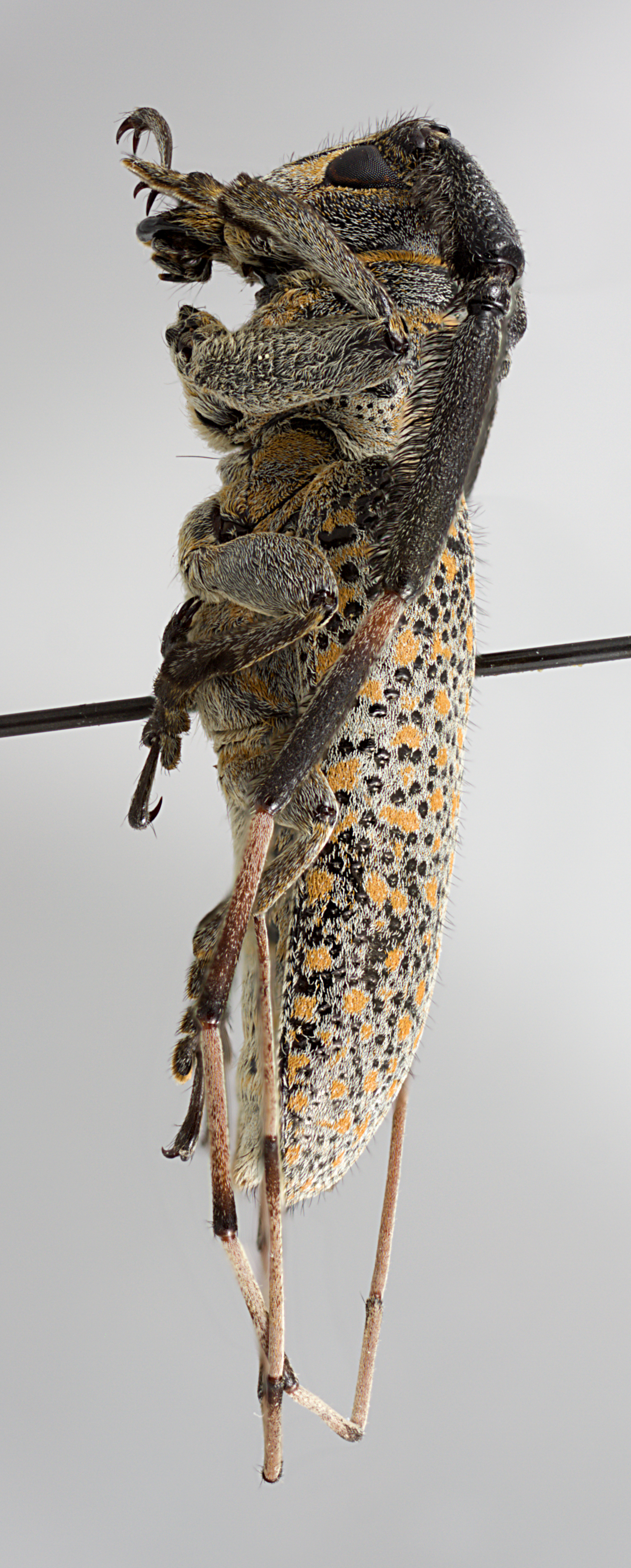 Elongate-oblong, moderate-sized, ranging from about 13–21 mm in length. Integument generally dark brown or black with whitish, ferrugineous, and ochraceous pubescence. Head with frons subquadrate to transverse, about as wide as width of four lower eye lobes. Eyes with lower lobes distinctly small, ovate. Genae elongate, distinctly taller than lower eye lobes. Antennal tubercles prominent, widely separated; tubercles not armed at apex or armed with a small projection. Antennae about as long as overall body length, or as much as twice as long; scape clavate, about as long or shorter than antennomere IV; antennomere III nearly straight or curved, longer than scape and antennomere IV, densely fimbriate beneath; antennomere XI shorter than X (females) or longer than X (males). Pronotum transverse, roughly cylindrical to conical, narrower at base, with lateral tubercles. Elytra with sides roughly parallel; elytral apices individually or jointly rounded; elytra generally uniform in coloration or speckled, or with distinct maculae; base of elytra without tubercles or with two or more prominent tubercles at humeri. Basal 1/3 of elytra with moderate to dense punctation, surface coarsely punctate or granulate-punctate. Procoxae without projection or with an obtuse tubercle. Mesosternal process with apex subtruncate to feebly emarginate. Metafemora short to distinctly short in length, about 1/4–1/5 as long as elytra.