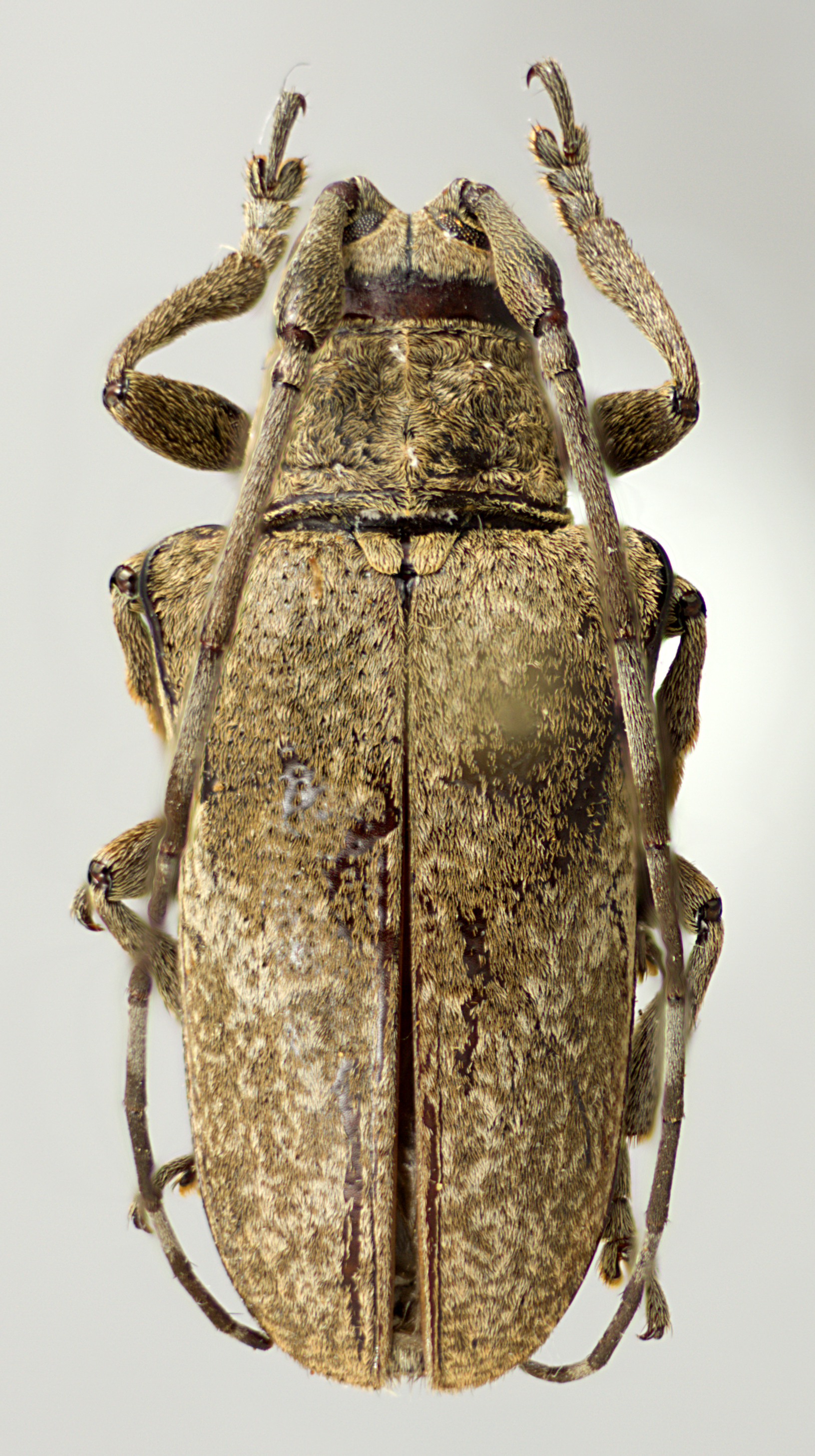 Elongate-ovate, small to moderate-sized, ranging from about 11–15 mm in length. Integument generally dark brown or black with whitish, ferrugineous, brown, and ochraceous pubescence. Head with frons elongate, about as wide as width of two lower eye lobes. Eyes with lower lobes oblong. Genae elongate, about as tall as lower eye lobes. Antennal tubercles prominent, moderately separated; tubercles not armed at apex or armed with a small projection. Antennae about as long as overall body length, or as much as 1 2/3 times as long; scape clavate, about as long as antennomere IV; antennomere III variable in shape, from nearly straight to curved to sinuate, longer than scape and antennomere IV. Pronotum transverse, roughly cylindrical to conical, wider at base, without lateral tubercles. Elytra with sides roughly parallel to attenuate; elytral apices individually to jointly rounded; elytra generally uniform in coloration or speckled; base of elytra with two prominent tubercles at humeri. Basal 1/3 of elytra with dense punctation, surface coarsely punctate or granulate-punctate. Procoxae without projection or with small acute projection or distinct, curved hook. Mesosternal process with apex feebly to deeply emarginate. Metafemora moderate in length, about 1/3 as long as elytra. Metatibiae distinctly expanded in males.