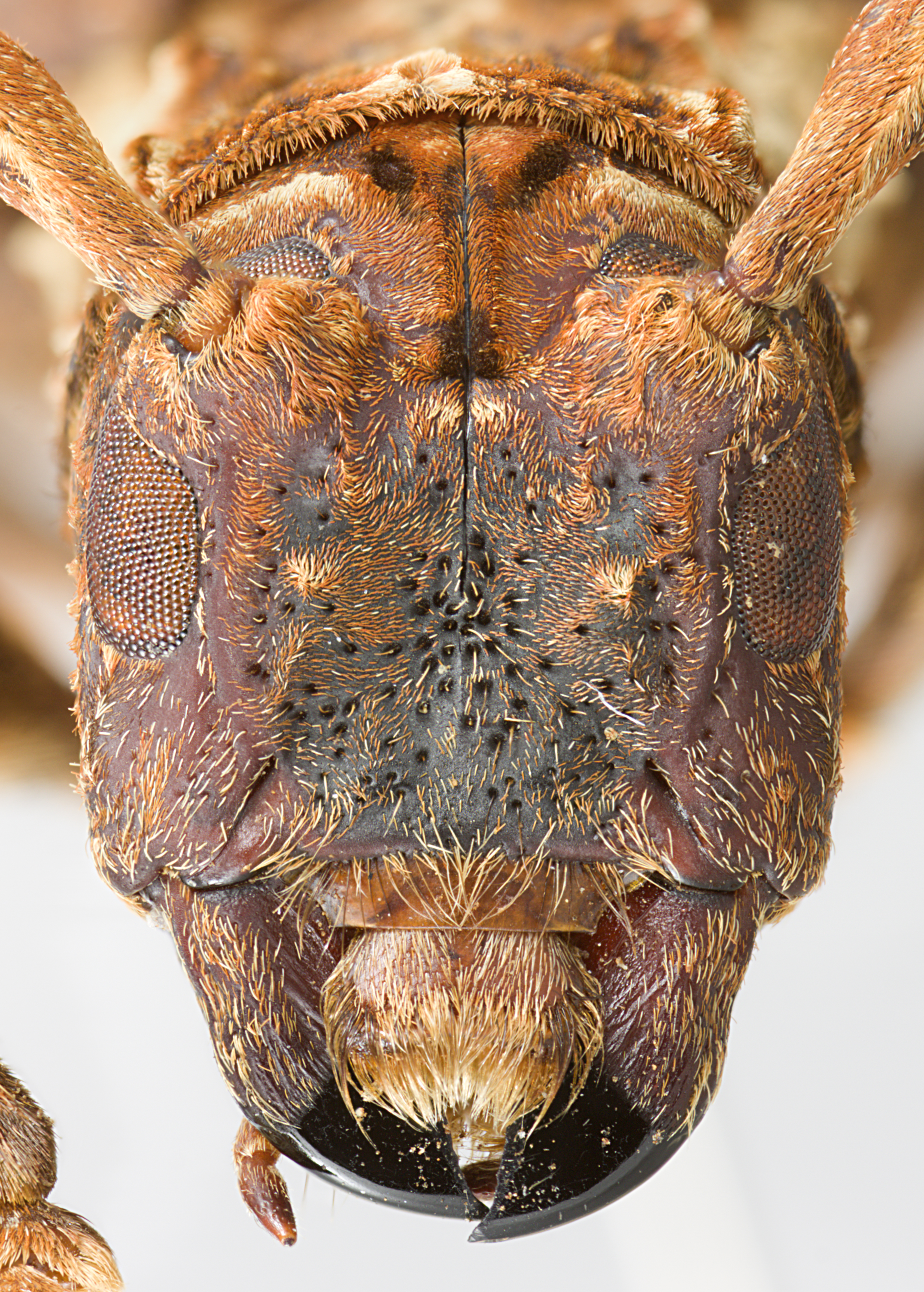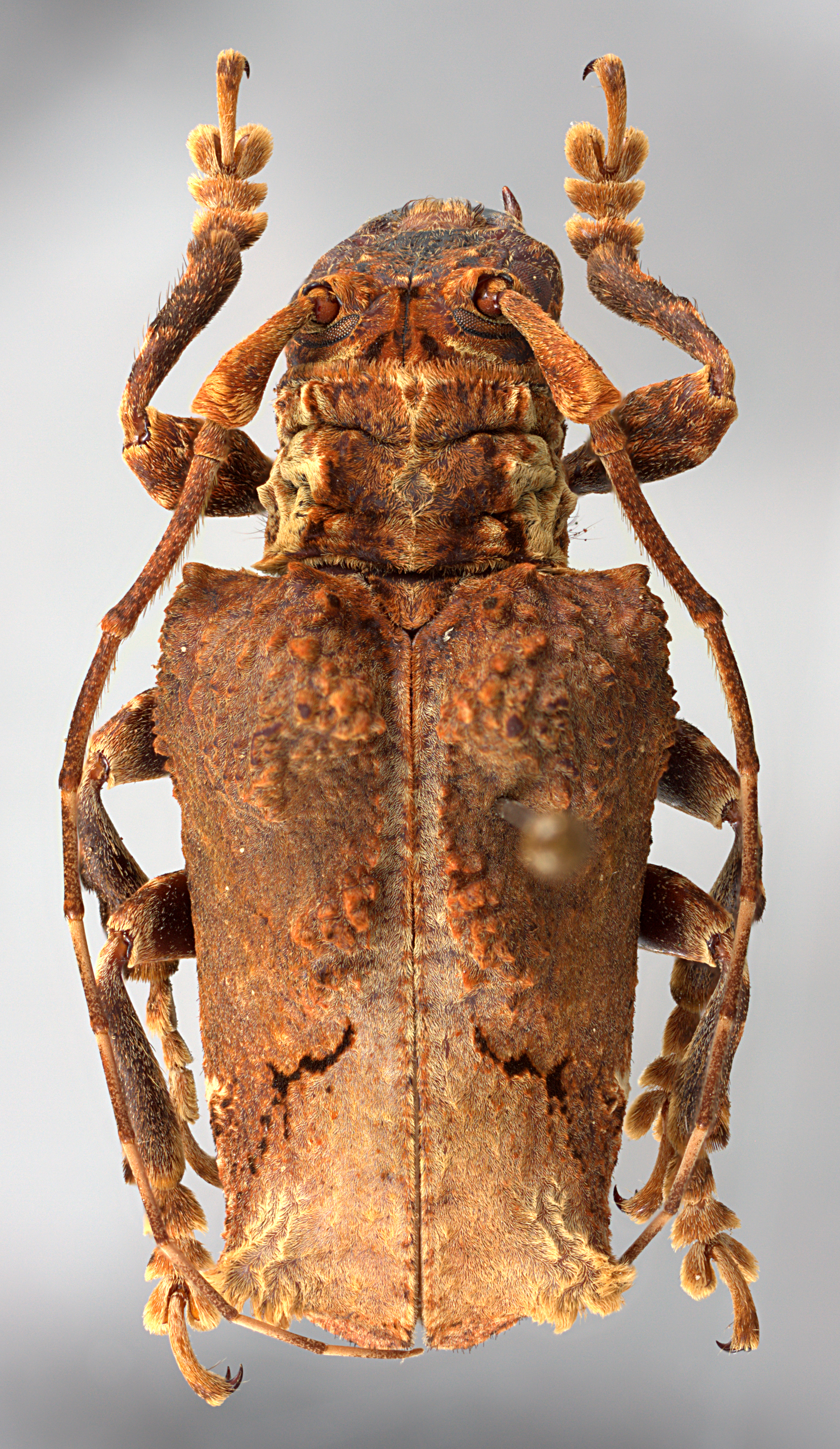 Elongate-ovate, robust, moderate to large-sized, ranging from about 15–26 mm in length. Integument generally dark brown or ferrugineous with whitish, ferrugineous, black, and ochraceous pubescence. Head with frons subquadrate to transverse, about as wide as width of four lower eye lobes. Eyes with lower lobes ovate-oblong. Genae subquadrate to elongate, variable in height, from distinctly shorter to distinctly taller than lower eye lobes. Antennal tubercles prominent, widely separated; tubercles not armed at apex or armed with a small projection. Antennae distinctly shorter than overall body length, or about as long; scape clavate, about as long as antennomere IV; antennomere III nearly straight or curved, longer than scape and antennomere IV. Pronotum subquadrate to transverse, roughly cylindrical to conical, wider at base, with or without lateral tubercles. Elytra with sides roughly parallel to attenuate; elytral apices individually rounded; elytra generally uniform in coloration or speckled, or with distinct maculae; base of elytra with two or more prominent, irregularly shaped, rough, blunt tubercles at humeri. Basal 1/3 of elytra with sparse to dense punctation, surface coarsely punctate to granulate-punctate. Procoxae without projection. Mesosternal process with apex subtruncate to deeply emarginate. Metafemora moderate to short in length, about 1/3–1/4 as long as elytra.