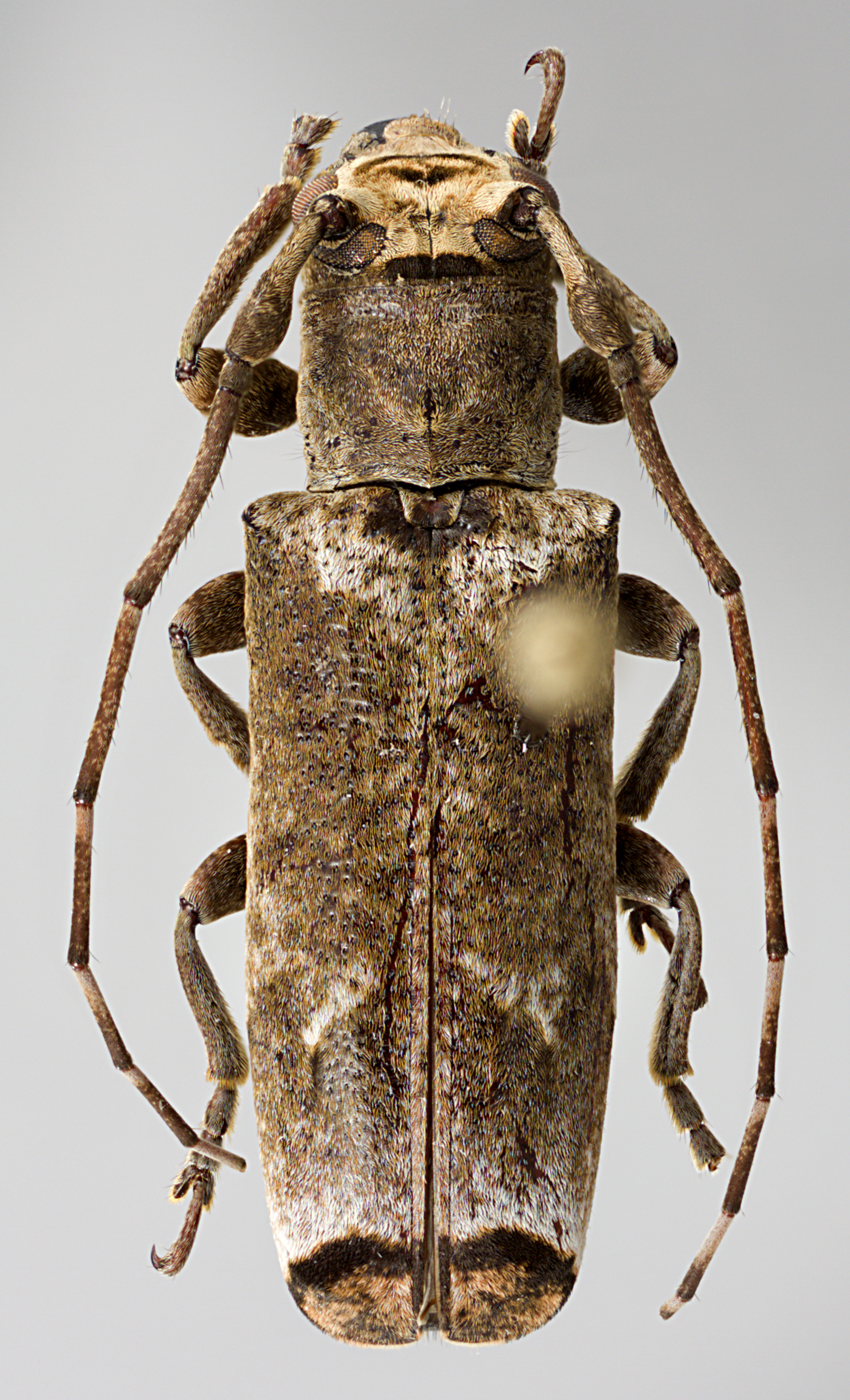 Elongate to elongate-oblong, small to moderate-sized, ranging from about 10–19 mm in length. Integument generally dark brown or black with whitish, black, brown, ferrugineous, and ochraceous pubescence. Head with frons subquadrate to elongate, about as wide as width of 2 1/2 lower eye lobes. Eyes with lower lobes oblong. Genae variable in shape, from subquadrate to elongate, distinctly shorter than lower eye lobes. Antennal tubercles prominent, widely separated; tubercles not armed at apex or armed with a small projection, or with a short, blunt horn, or with a moderately long, blunt horn or large blunt process. Antennae about as long as overall body length, or as much as twice as long (males); scape clavate, shorter than antennomere IV; antennomere III variable in shape, from nearly straight to curved to sinuate, longer than scape and about as long or longer than antennomere IV; antennomere XI shorter than X (females) or longer than X (males). Pronotum subquadrate to transverse, roughly cylindrical to conical, distinctly narrower at base, with or without lateral tubercles. Elytra with sides roughly parallel to slightly attenuate; elytral apices individually rounded; elytra generally uniform in coloration or speckled, or with distinct maculae; base of elytra without tubercles or with two prominent tubercles at humeri. Basal 1/3 of elytra with moderate to dense punctation, surface coarsely punctate or granulate-punctate. Procoxae without projection or with an obtuse tubercle or with distinct, curved hook (males). Mesosternal process with apex subtruncate to feebly emarginate. Metafemora short to distinctly short in length, about 1/4–1/5 as long as elytra.