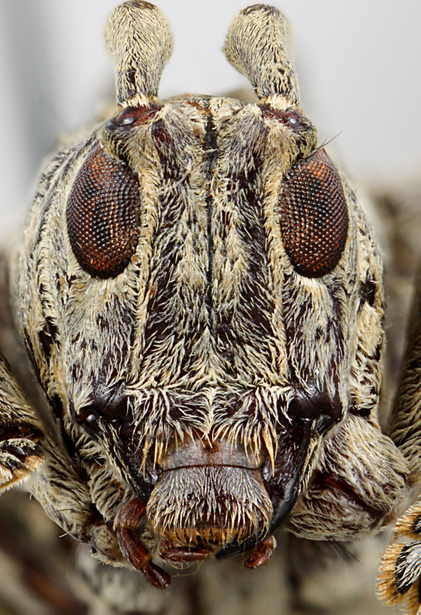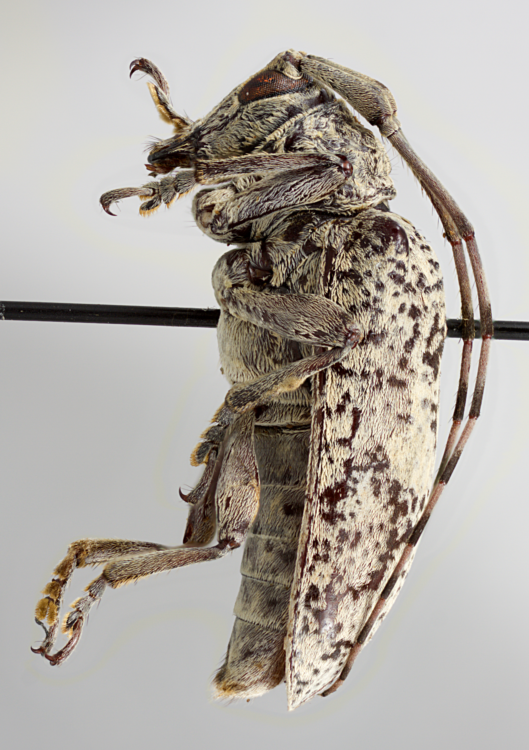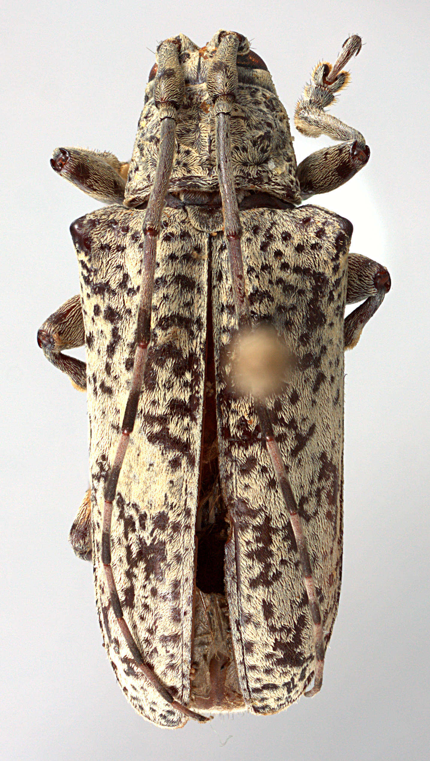 Elongate-ovate, moderate-sized, about 18-23 mm in length. Integument generally dark brown or ferrugineous with whitish and ochraceous pubescence. Head with frons elongate, about as wide as width of 1 1/2 lower eye lobes. Eyes with lower lobes ovate. Genae elongate, about as tall or shorter than lower eye lobes. Antennal tubercles prominent, narrowly separated; tubercles armed at apex with shot, blunt horn (females) or with a moderately long, blunt horn (males). Antennae about as long as overall body length (females), or as much as twice as long (males); scape clavate about as long or shorter than antennomere IV; antennomere III sinuate, longer than scape and antennomere IV; antennomere XI shorter than X (females) or longer than X (males). Pronotum transverse, conical, wider at base, without lateral tubercles. Elytra with sides attenuate; elytral apices individually rounded; elytra generally uniform in coloration or speckled; base of elytra with two prominent tubercles at humeri. Basal 1/3 of elytra with dense punctation, surface coarsely punctate or granulate-punctate. Procoxae without projection or with distinct, curved hook (males). Mesosternal process with apex feebly to deeply emarginate. Metafemora moderate in length, about 1/3 as long as elytra.