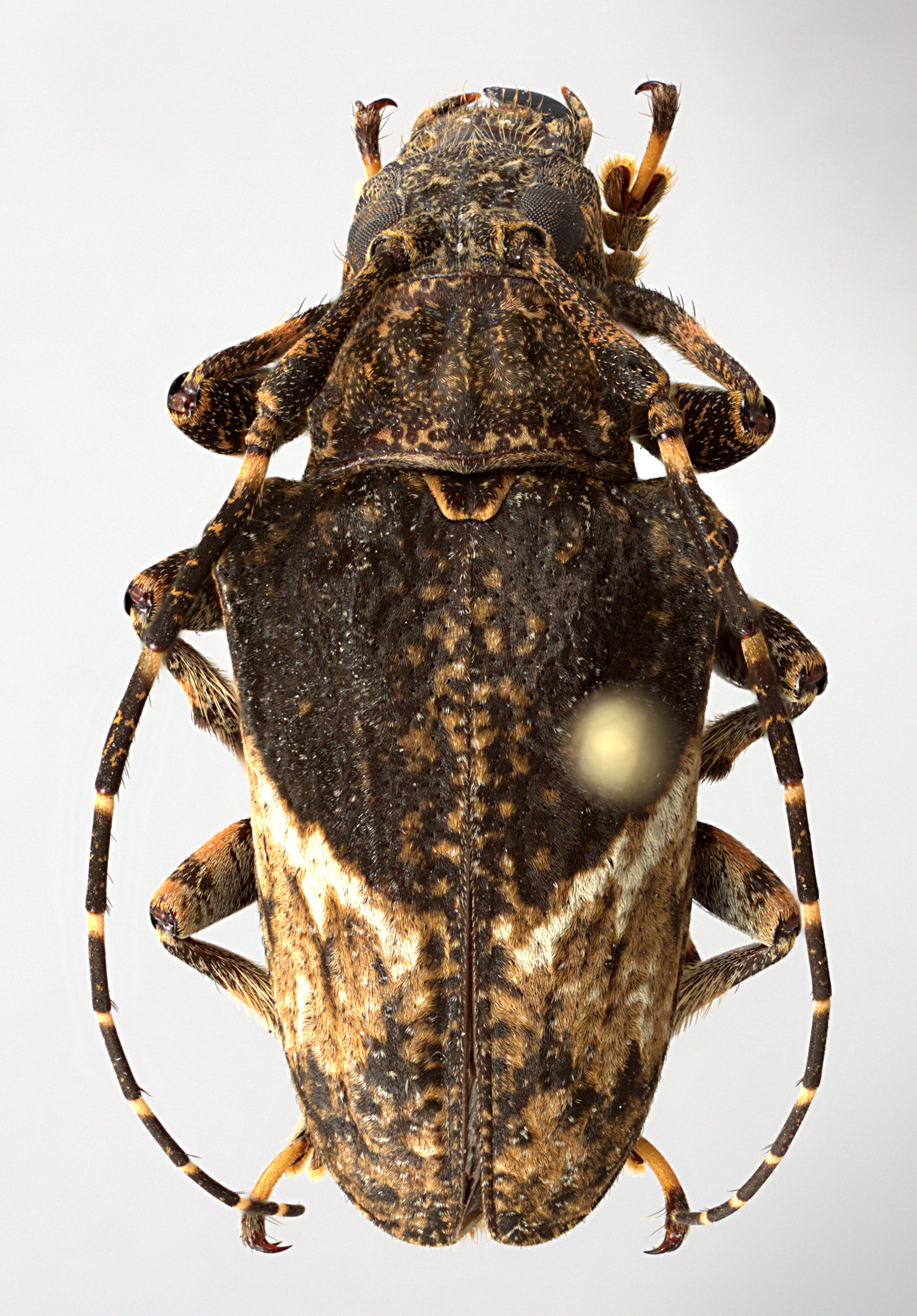 Elongate-ovate, small to large-sized, ranging from about 9–21 mm in length. Integument generally dark brown or black with whitish, ferrugineous, brown, black, and ochraceous pubescence. Head with frons elongate, about as wide as width of 1 1/2 lower eye lobes. Eyes with lower lobes ovate-oblong. Genae elongate, about as tall or distinctly shorter than lower eye lobes. Antennal tubercles prominent, moderately to narrowly separated; tubercles not armed at apex or armed with a small projection, or with a short, blunt horn, or with a moderately long, blunt horn. Antennae shorter (females) than overall body length, or as much as twice as long (males); scape clavate, about as long or longer than antennomere IV; antennomere III sinuate, longer than scape and antennomere IV. Pronotum transverse, conical, distinctly wider at base, without lateral tubercles. Elytra with sides attenuate; elytral apices individually rounded; elytra generally uniform in coloration or speckled, or with distinct maculae; base of elytra with two prominent tubercles at humeri. Basal 1/3 of elytra with moderate to dense punctation, surface finely punctate, coarsely punctate, or granulate-punctate. Procoxae without projection or with distinct, curved hook. Mesosternal process with apex feebly to deeply emarginate. Metafemora long to moderate in length, about 1/2–1/3 as long as elytra.