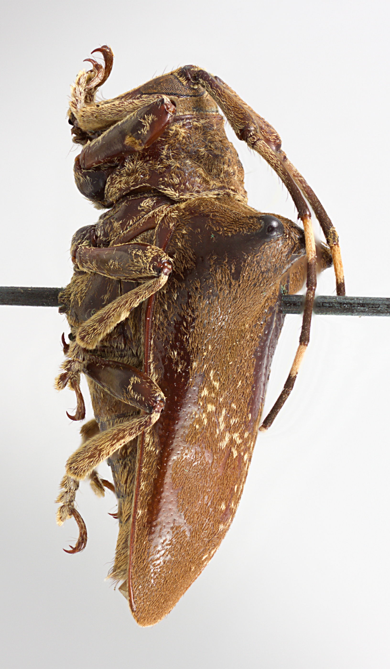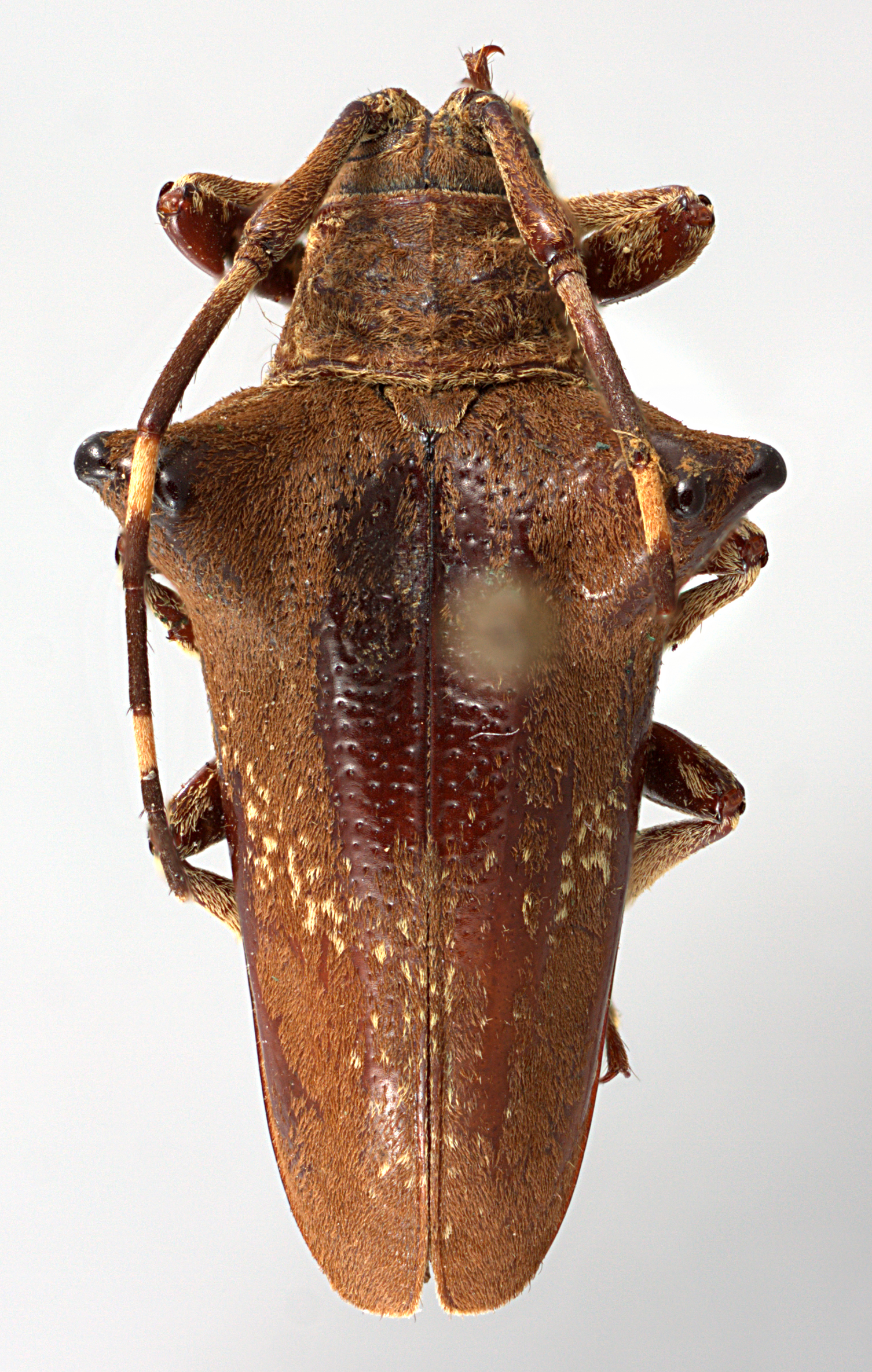 Elongate-ovate, robust, moderate-sized, ranging from about 13–18 mm in length. Integument generally dark brown or ferrugineous with whitish, brown, ferrugineous, and ochraceous pubescence. Head with frons elongate, about as wide as width of two lower eye lobes. Eyes with lower lobes ovate-oblong. Genae elongate, about as tall or distinctly taller than lower eye lobes. Antennal tubercles prominent, narrowly separated; tubercles not armed at apex. Antennae about as long as overall body length or as much as 1 2/3 times as long; scape clavate, about as long or longer than antennomere IV; antennomere III curved, about as long or longer than scape and longer than antennomere IV. Pronotum transverse, strongly conical, distinctly wider at base, without lateral tubercles. Elytra with sides strongly attenuate; elytral apices individually rounded; elytra generally uniform in coloration or speckled; base of elytra with four strongly projecting, large, obtuse tubercles. Basal 1/3 of elytra with dense punctation, surface coarsely punctate. Procoxae without projection or with small acute projection or distinct, curved hook (males). Mesosternal process with apex feebly to deeply emarginate. Metafemora moderate in length, about 1/3 as long as elytra.
