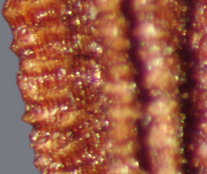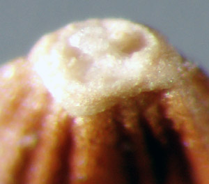 Fruit an achene, flattened, narrowly elliptical to oblong in outline, frequently slightly curved, (1.8)2.4–4.5 mm long, 0.6–1.4 mm wide, 0.3–0.6 mm thick, narrowly elliptical in cross section; both ends truncate. Covered with ca. 10–16 prominent longitudinal ribs; ribs cross-grooved, appearing tubercled. Dark brown to light- and reddish-brown, dull to faintly glistening. Scar a round, slightly oblique, 4-segmented collar, rim and cavity cream colored. Apex horizontal, a +/– oval ring, cream colored, surrounding slender whitish style base variable in appearance or inconspicuous. Pappus of numerous white hairs, 1.5 cm long, +/– persistent. Embryo straight, spatulate; endosperm absent.