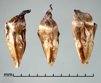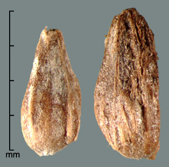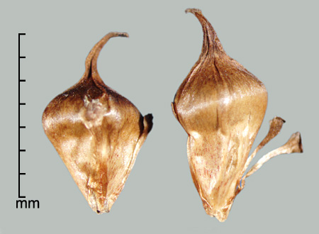 Fruit an achene, 4.5–7.5 mm long (not including beak), 1.5–4 mm wide and thick. Obpyramidal, but angles sometimes softened due to crowding, usually with a distinct shoulder between upper and lower parts, elliptic or oblong to obtrullate in outline, round to angled in cross section. Lower part pyramidal to narrowly obconical, sometimes ridged, usually with 3–4 persistent tepals attached at base and ending at shoulder (+/– appressed) to edges. Upper part dome-shaped, persistent style base forming a beak. Indurate; surface +/– wrinkled, lustrous, light brown to brown, often grading to darker brown at apex. Endocarp stony, ridged. Embryo axile-linear; endosperm present.
