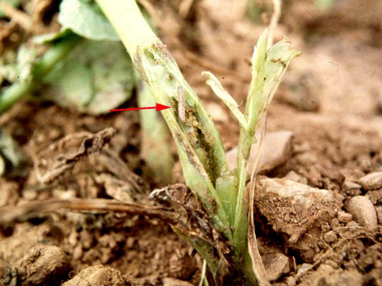 Larva of Symmetrischema tangolias feeding inside stem of potato plant. © Frans C. Griepink, Pherobank (The Netherlands). |