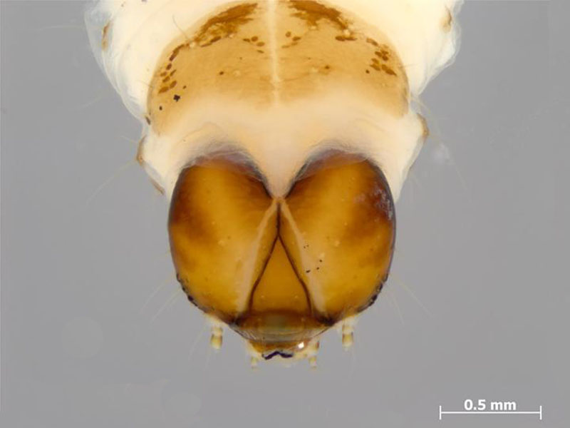 Head and prothoracic shield of Symmetrischema tangolias larva. © Ministry for Primary Industries, Plant Health and Environment Laboratory (New Zealand). |