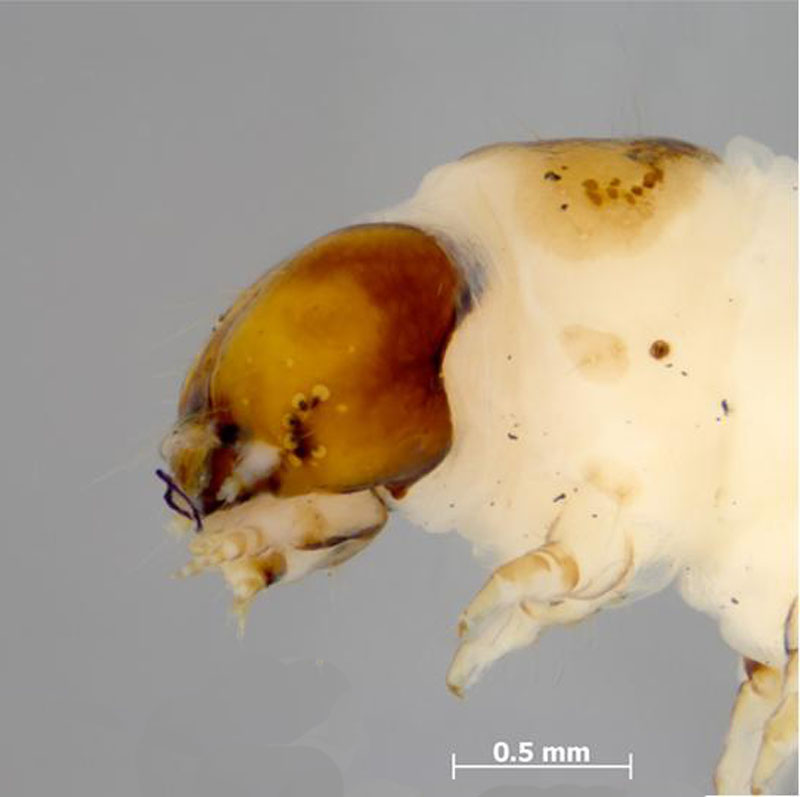 Head of Symmetrischema tangolias larva, lateral aspect. © Ministry for Primary Industries, Plant Health and Environment Laboratory (New Zealand). |