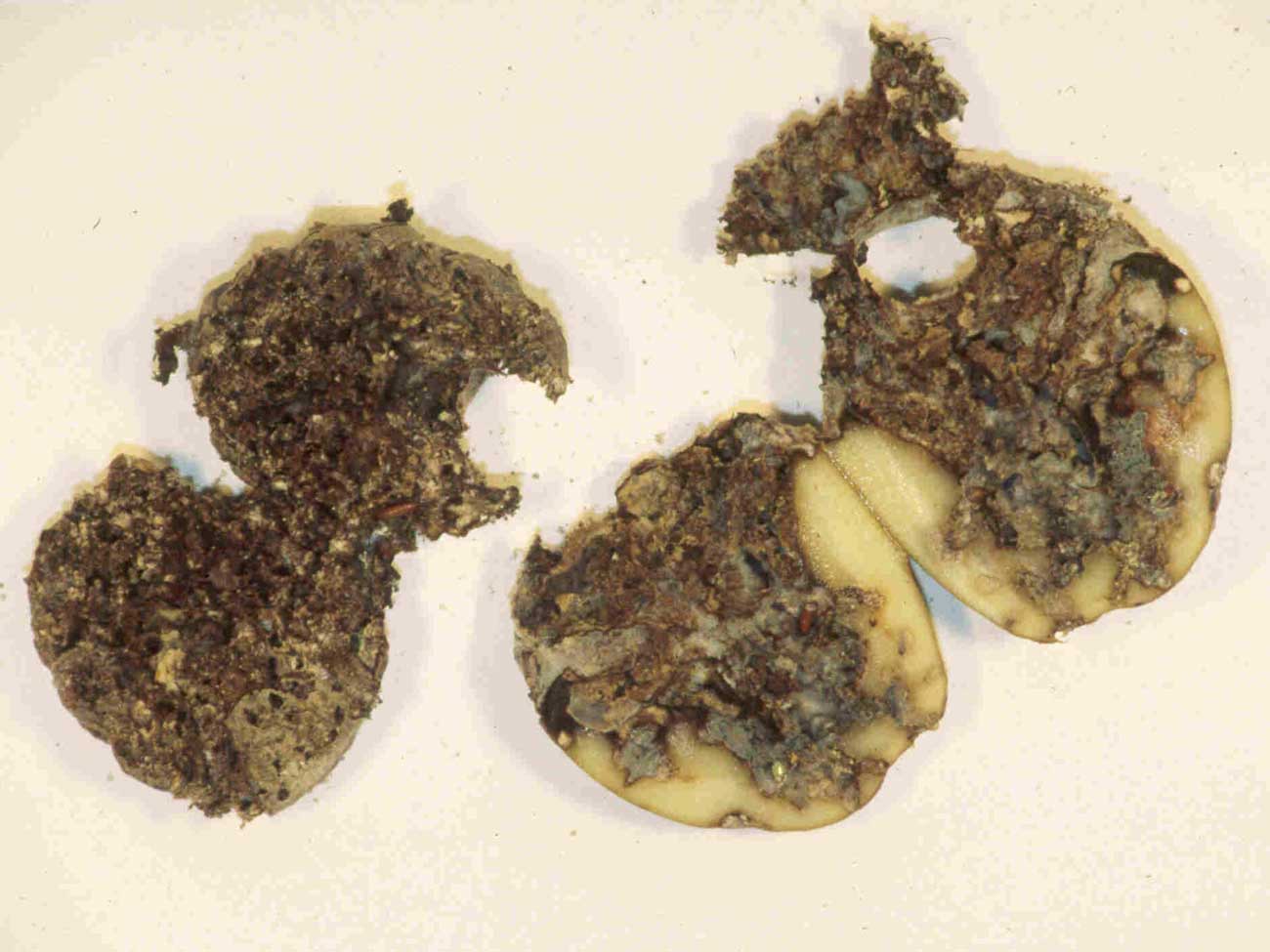 Larval feeding damage in potato tubers by Symmetrischema tangolias. Photo © Frans C. Griepink, Pherobank The Netherlands. |