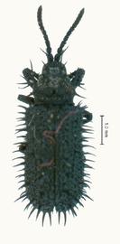 Elytron: lateral margin straight, with slender spines of various lengths; exterior apical angle rounded, with slender spines of various lengths; apical margin rounded, with slender spines of various lengths; humerus angulate, not produced; with 8 rows of punctures plus scutellar row; disc with slender spines of various lengths.