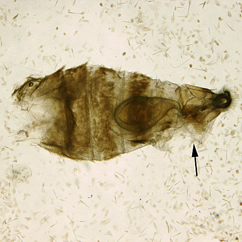 Step 3: After the majority of scales are removed from the posterior segments, separate the genitalia from the rest of the abdomen. Using two pairs of forceps, hold the abdomen between the 6th and 7th segments (arrow), and carefully tear between the sclerites. It may be helpful to partially separate one side, and then start on the opposite side.