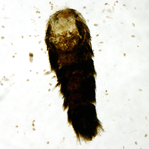 Step 1: After sufficient soaking in KOH, place the abdomen in a Syracuse dish full of water. A drop of soapy water can be used to break the surface tension so that the abdomen does not continually float to the surface. Use two small brushes to manipulate the abdomen.