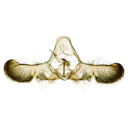 Step 8: Place the clean genitalia into a small petri dish with 100% ethanol. Using forceps, gently spread the valvae and place the genitalia under a small piece of glass (a broken microscope slide will work). The ethanol dehydrates and stiffens the genitalia so that it retains this position when placed on the microscope slide. Some taxa may be easy to position; others may be very difficult. It is important to work quickly as the genitalia will begin to stiffen in a short period of time.