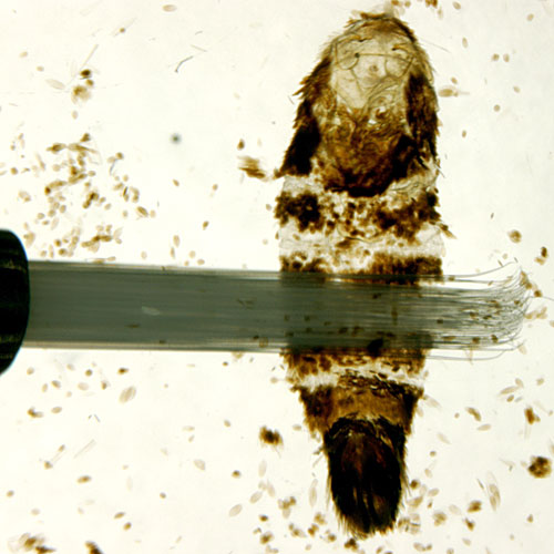 Step 2: While holding the abdomen down with one brush, gently start removing scales with the other brush. The abdomen can be brushed in any direction, but care should be taken to not tear the abdomen or damage the genitalia. It is helpful to remove scales from the sterigma and posterior segments while they are still attached to the abdomen.