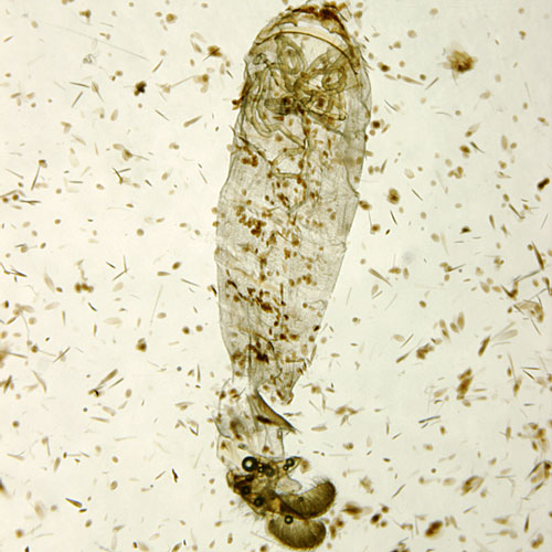 Step 8: Place the clean genitalia into a small petri dish with 100% ethanol. Flatten the genitalia under a small piece of glass (a broken microscope slide will work). The ethanol dehydrates and stiffens the genitalia so that it retains this position when placed on the microscope slide. Be careful to not smash or heavily distort the papillae anales. Although female genitalia are much easier to position than male genitalia, it is important to work quickly as the genitalia will begin to stiffen in a short period of time.