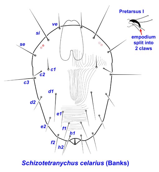 (f2 absent). Other Tetranychinae lack the split empodial clawclaw: