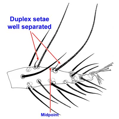 split into 2–3 pairs of proximoventral hairsproximoventral hairs: