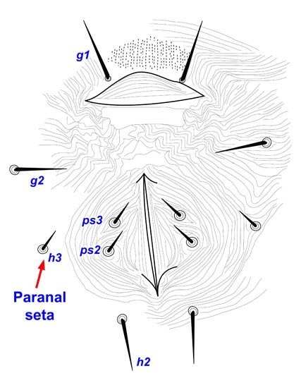 A system of setal designations of spider mites in Pritchard & Baker 1955 (A revision of the spider mite family Tetranychidae. Mem. Pac. Coast Entomol. Soc. 2: 1-472.). Dorsocentrals: D1 = c1; D2 = d1; D3 = e1; D4 = f1; D5 = h1; Dorsolaterals: L1 = c2; L2 = d2; L3 = e2; L4 = f2; Sublaterals: 1st sublaterals = c3; 2nd sublaterals = d3; 3rd sublaterals = e3; Humerals: H = c3; also Inner sacrals (or DC4) = f1; Outer sacrals (or L4) = f2; Clunals (or DC5) = h1 or f3; Postanals (or posterior para-anals) = h2; Anterior para-anals = h3; Anals = ps1-3; 1st genitals (or anteromedial genitals) = g1; 2nd genitals (or posterolateral genitals)= g2; Pregenitals = ag in the Grandjean system.