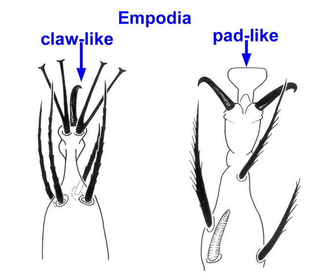 (pl. empodia) an unpaired structure arising between the tarsal claws, ranging from pad-like to claw-like and often bearing structures such as tenent hairs, dense setulae, or taking the form of a featherclaw (Eriophyoidea)..