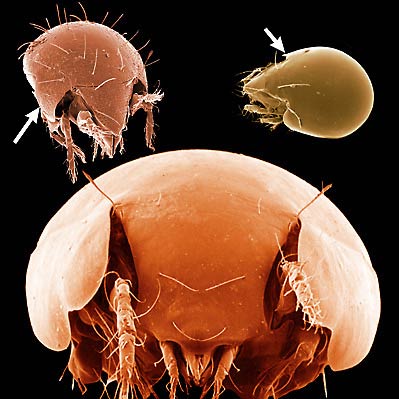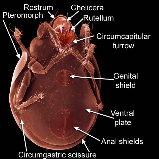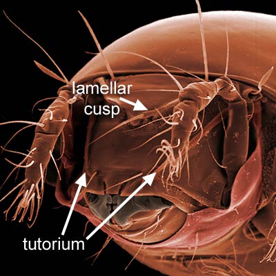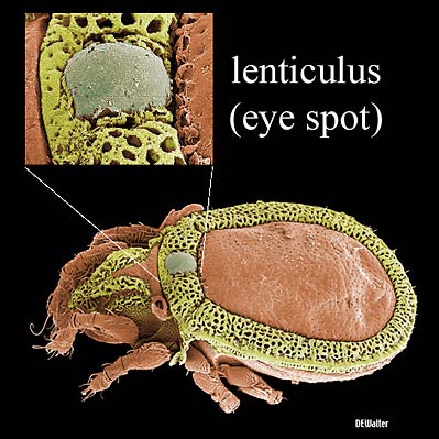 oribatid mites could be confused with other fully armored mites in the Prostigmata (Labidostommatides, Scutacaridae), Mesostigmata (Uropodidae, Ologamasidae, Eviphididae), or the hypopi of the Astigmatina, but none of these will have a single pair of prodorsal trichobothriatrichobothrium: