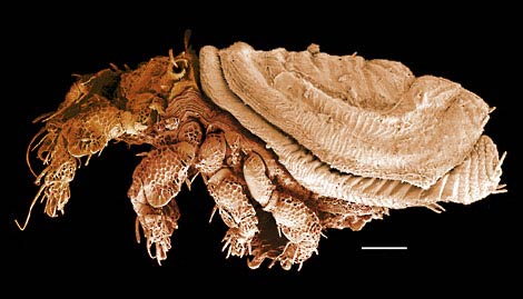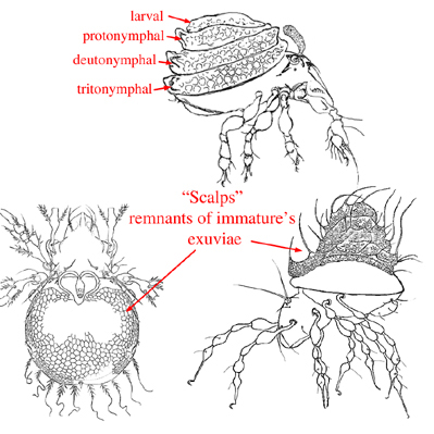 notogastral portions of exuviae retained by some oribatid mites, often as a pagoda-like pile of larval through tritonymphal exuviae, although one or more of these may fall off during handling of specimens. Scalp is also used to indicate the macerated cuticle of a mite that has been cleared and mounted on a microscope slide.